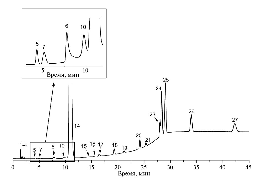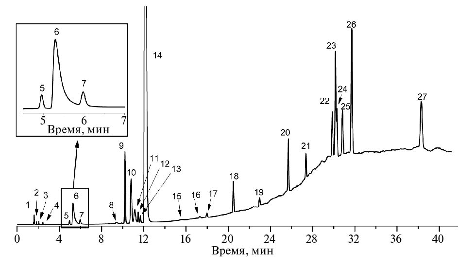 1 — метан; 2 — ацетилен; 3 — этилен; 4 — этан; 5 — пропилен; 6 – метанол; 7 — пропан; 10 — 1-бутен; 14 — н–бутан; 15 — неопентан; 16 — изо-пентан; 17 — н-пентан; 18 — бензол; 19 — н-гексан; 20 — толуол; 21 — н-гептан; 23 — м-ксилол; 24 — п-ксилол; 25 — о-ксилол; 26 — н-октан; 27 – н-нонан [43].
