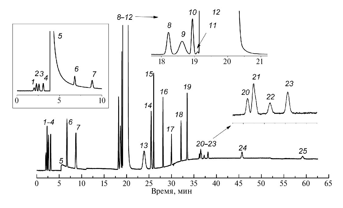 1 — метан, 2 — ацетилен, 3 — этилен, 4 — этан, 5 — метанол, 6 — пропилен, 7 — н-пропан, 8 — 1-бутен, 9 — изо-бутан, 10 — транс-2-бутен, 11 — цис-2-бутен, 12 — н-бутан, 13 — нео-пентан, 14 — изо-пентан, 15 — н-пентан, 16 — н-гексан, 17 — бензол, 18 – н-гептан, 19 — толуол, 20 — м-ксилол, 21 — п-ксилол, 22 — o-ксилол, 23 — н-октан, 24 — н-нонан, 25 — н-декан [23, 24].
