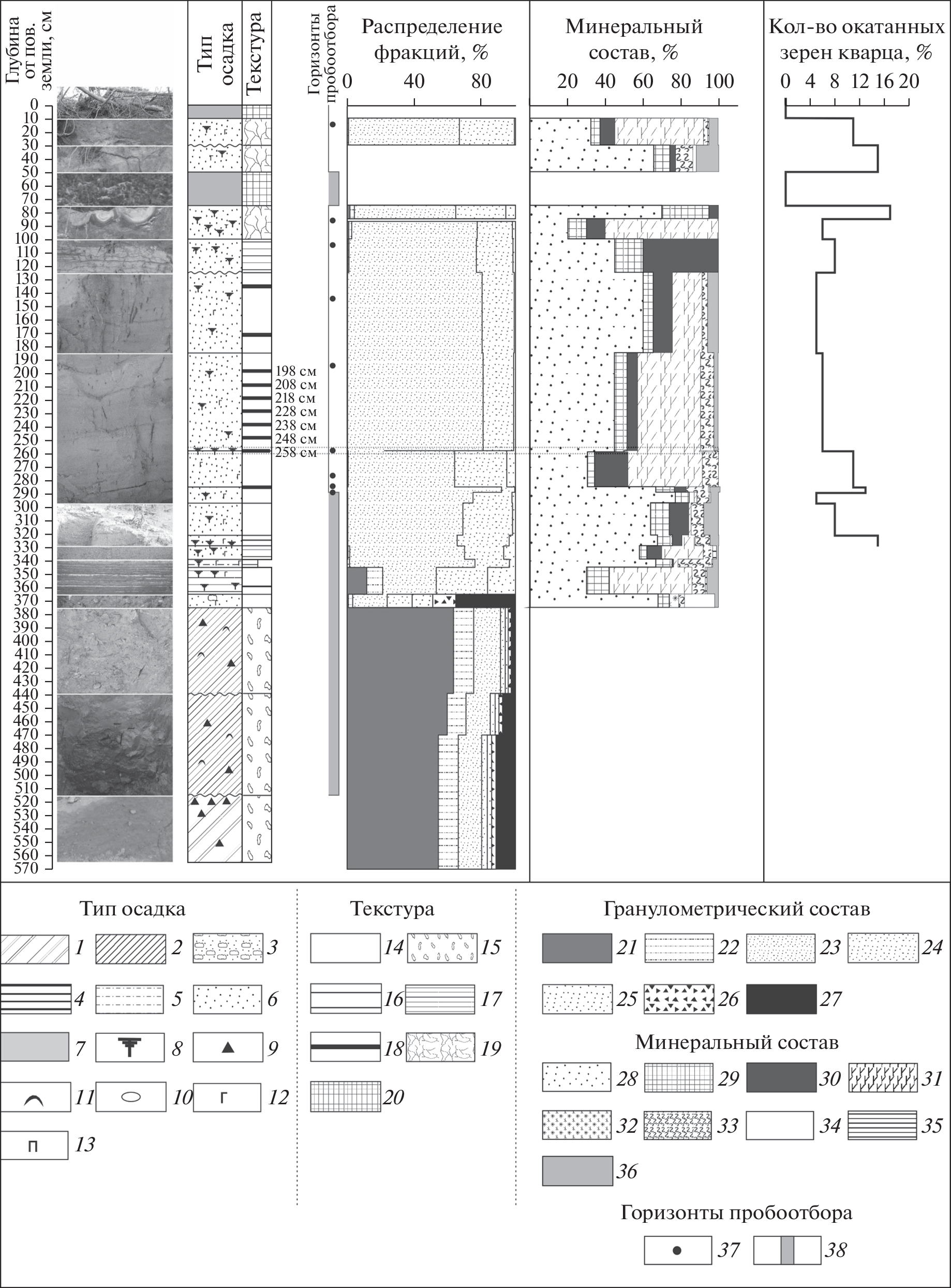 As part of paleogeographic studies on the Curonian Spit (geological section GS 024), a coastal section was studied from the sea in the area of the village Lesnoy in the place where relic lagoon oozes come out. The granulometric, chemical and mineral compositions of slope sands were studied for the first time. The heterogeneity of the conditions for the formation of sand strata was confirmed. A high probability of a secondary change in the composition of sediments as a result of weathering processes was revealed. The results of the study indicate a gradual advance of sand deposits on the coastal part of the lagoon, which began about 10 thousand years ago. Differentiation of the sand stratum into the lower and upper parts relative to the interlayer-marker of coarse-grained sand identified in the section may reflect different stages of generation of the sand stratum: from the supposed shallow swell formed during sea level rise to beach and eolian sands.
