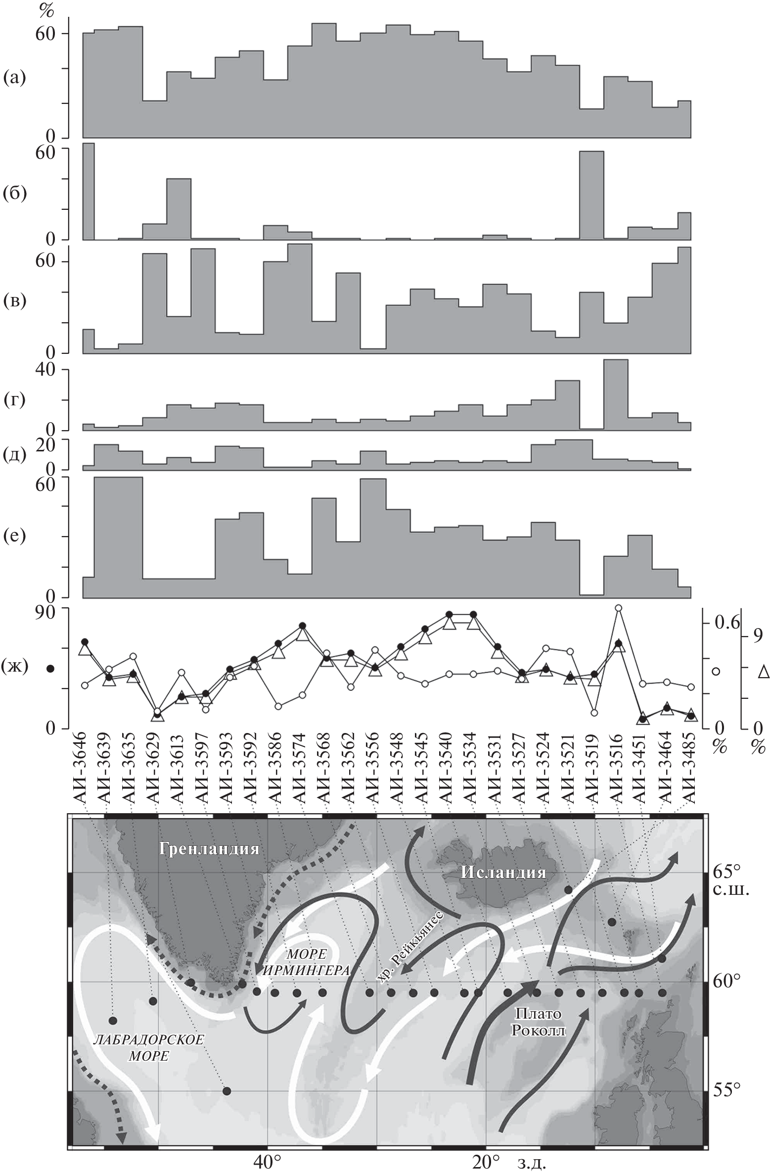 An analysis of the lithological, isotope-geochemical, and micropaleontological parameters of the surface layer of bottom sediments in the North Atlantic was made at 26 stations on the profile along 59.5° N. The distribution of humidity and granulometric composition of sediments reflects vertical/circumcontinental zonality, since fine-grained and water-saturated material accumulates in the deepest parts of the Iceland Basin and the Labrador and Irminger seas, which are farthest from land. Larger masses of calcium carbonate are also formed there, but organic carbon is unevenly distributed. Both vertical/circumcontinental and climatic (circulation of the warm North Atlantic water) zonalities affect the mineral composition of the sediment fraction >0.063 mm. The accumulation of diatoms, radiolarians, and planktic foraminifers in sediments reflects both vertical/circumcontinental and, to a greater extent, climatic zonality. Variations in the isotopic oxygen and carbon ratios in the shells of benthic and planktic foraminifers require a complex interpretation involving data on the parameters of various surface and bottom water masses. The distribution of planktic microfossil assemblages according to cluster analysis shows areas of distribution of different water masses with a clear boundary along the eastern margin of the Subpolar Gyre. The distribution of “cluster” assemblages of benthic foraminifers does not correspond much to that of planktic microfossils, reflecting the division of the water area into abyssal and shallow water areas.