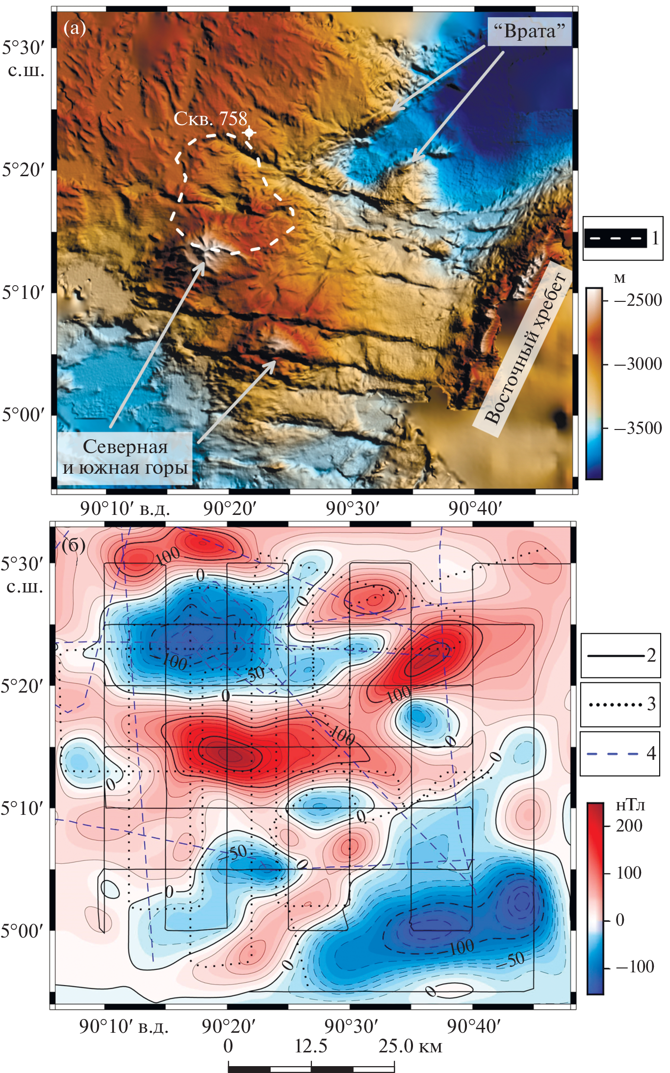 The geophysical survey in cruise# 42 of R/V Akademik Boris Petrov (2017) at the polygon near Site 758 ODP clarified significantly knowledge about the bottom topography of the northern segment of the Ninetyeast Ridge. It is crossed by E–W transversal linear troughs, apparently being young tectonic fractures. The morphology of the narrow elevated block in the central part of the deep depression between neighboring large volcanic edifices is characterized in detail. Along with linear tectonic structures, the main features of this block are two volcanic seamounts. The detail magnetic survey at the polygon identified for the first time the nature of the sources of magnetic anomalies on the Ninetyeast Ridge. Intense local magnetic anomalies are observed here, both confined to local structures of the bottom and basement relief, and clearly unrelated to them. These anomalies are of a complex interfering nature caused by the superposition of fields from sources separated by magnetization, spatial position and age. According to the results of paleomagnetic analysis of the anomalies, the age of the structures here is very wide: the youngest features were formed about 20 million years ago, the oldest ones–over 80 million years ago.