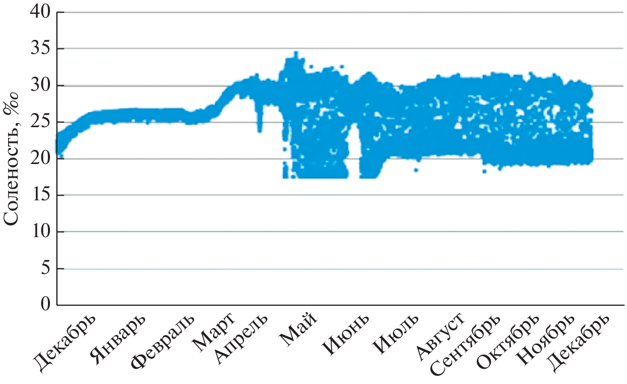 The bioelectrogenic activity of sediments of natural microbial association of the Peter’s Bay of Japanese sea research was performed in a year-round experiment with parallel temperature, illumination and water electrical conductivity monitoring by means of benthic microbial fuel cell (MFC) and automatic online-monitoring. Several variants of underwater devices, including benthic microbial fuel cells, monitoring water environment sensor,information collection and transmission systems, have been developed. This device make electrical voltage up to 216 mV, specific power up to 239 mW/m2. Electrogenic activity of natural microflora depends on water temperature and reach maximum on summer with temperature about 20–25°C. The introduction of toxicants in form as hydrocarbons and cadmium into the sluge led to the suppression of microbial electrogenesis. However the introduction of inductor substances of microbial sulfidogenesis led to the stimulation of microbial electrogenesis. The possibility of functioning of the benthic MFC in the field of the Peter’s Great Bay in various climatic periods is shown. It is shown that such experimental devices serve as a basis for autonomous stations monitoring the state of the aquatic environment for a long time and in a wide range of conditions change. Thus, automatic registration of temperature, illumination and salinity of water with a frequency of 48 times a day was carried out for 13 months (11/28/2019–12/31/2020). The electrogenic activity of this microbiota upon MFC scaling can potentially become a new renewable energy source for low-power marine electronics, including those used in mariculture.