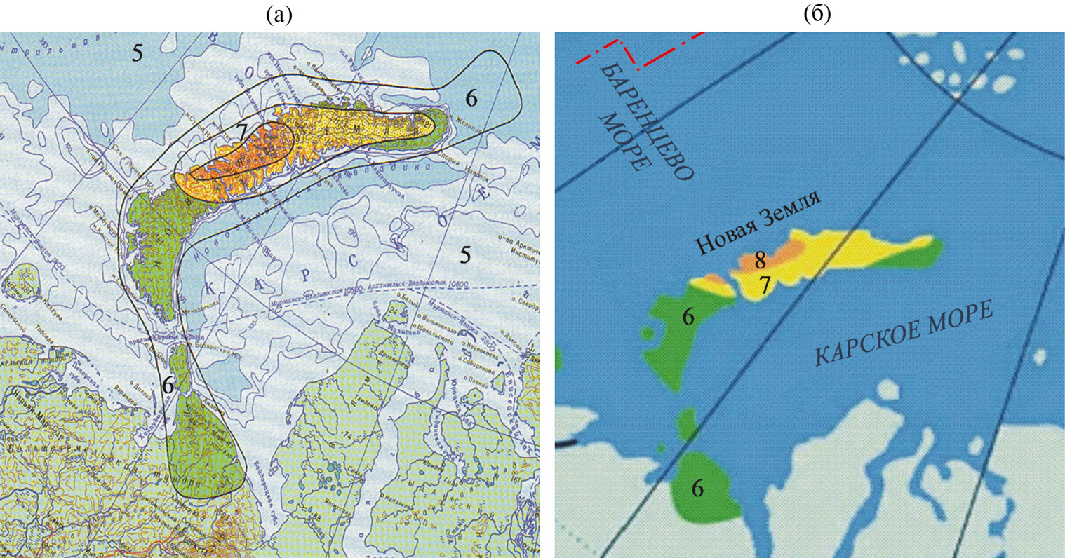 Рис. 1. Фрагменты карт общего сейсмического районирования ОСР-97С (а) и ОСР-2015С (б) для акваторий Печорского и Карского морей для вероятности превышения интенсивности сейсмических сотрясений 1% за 50 лет эксплуатации сооружения (период повторяемости сотрясений 5000 лет). Черными цифрами указана интенсивность сотрясений в баллах шкалы MSK-64, черные контуры — изолинии бальности