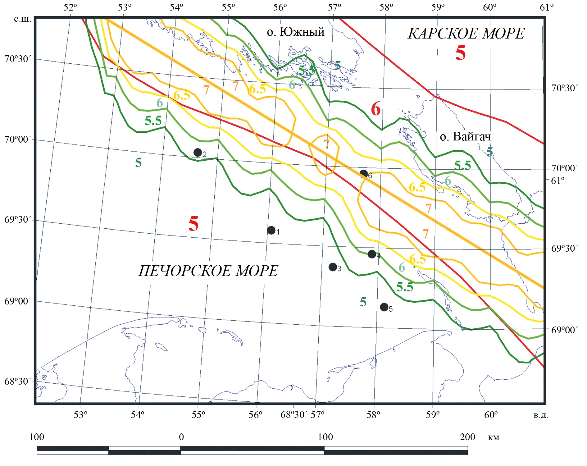 В предыдущих исследованиях [2] было определено, что в шельфовой зоне Печорского моря, примыкающей к о. Южному архипелага Новая Земля, возможны сейсмические сотрясения величиной 4.5 балла.