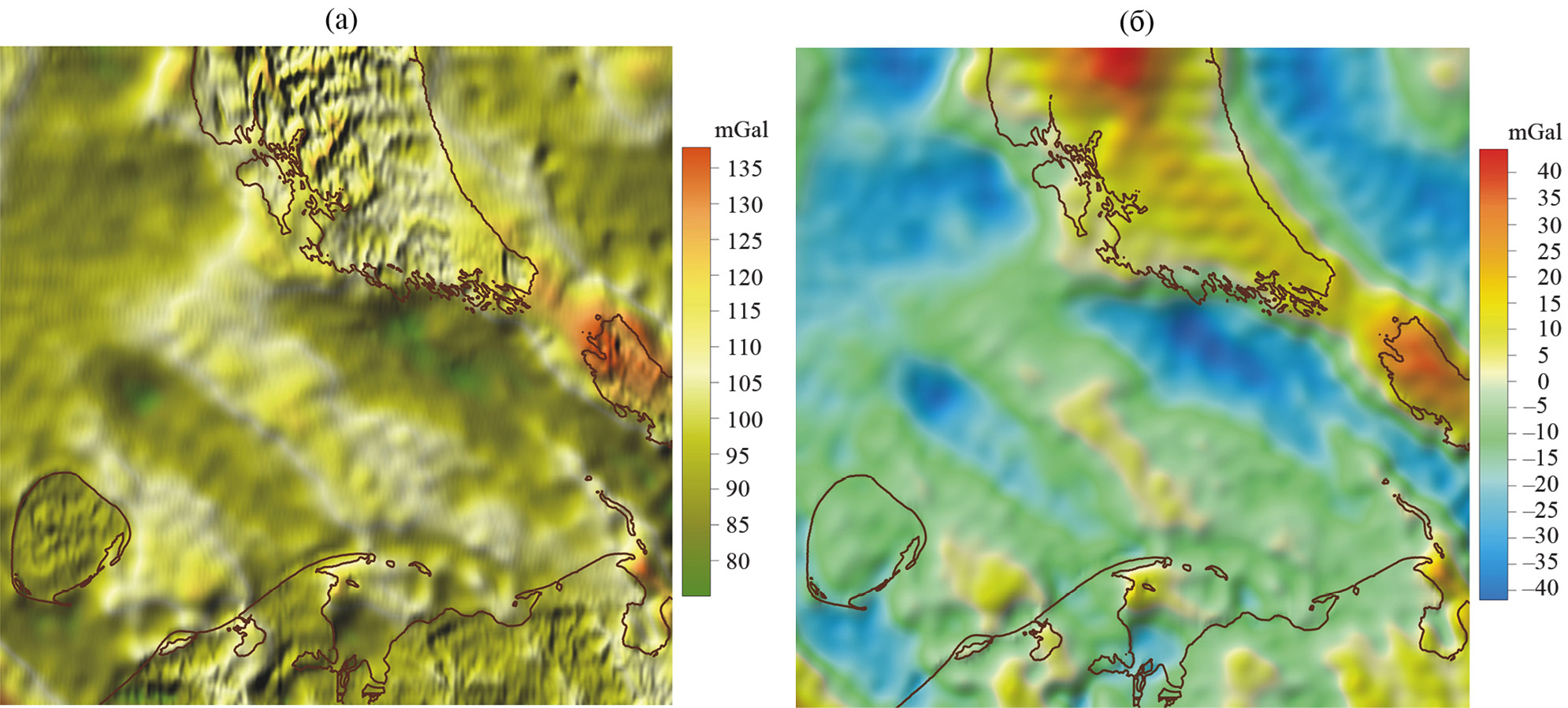 Рис. 3. Гравитационные аномалии в районе Печорского и Карского морей в редукциях Буге (а) и свободного воздуха (б) по данным [30]