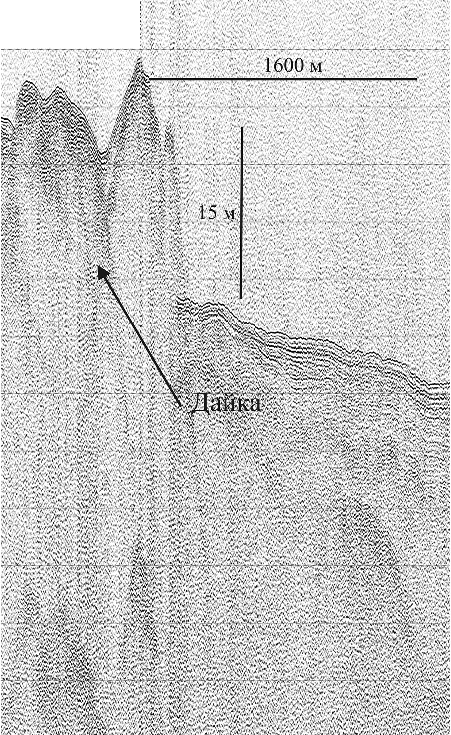 Рис. 4. Пример, демонстрирующий внедрение магматитов в осадки (дайка) в районе Североуральского линеамента. Обнаружен на профиле НСП в Печорском море