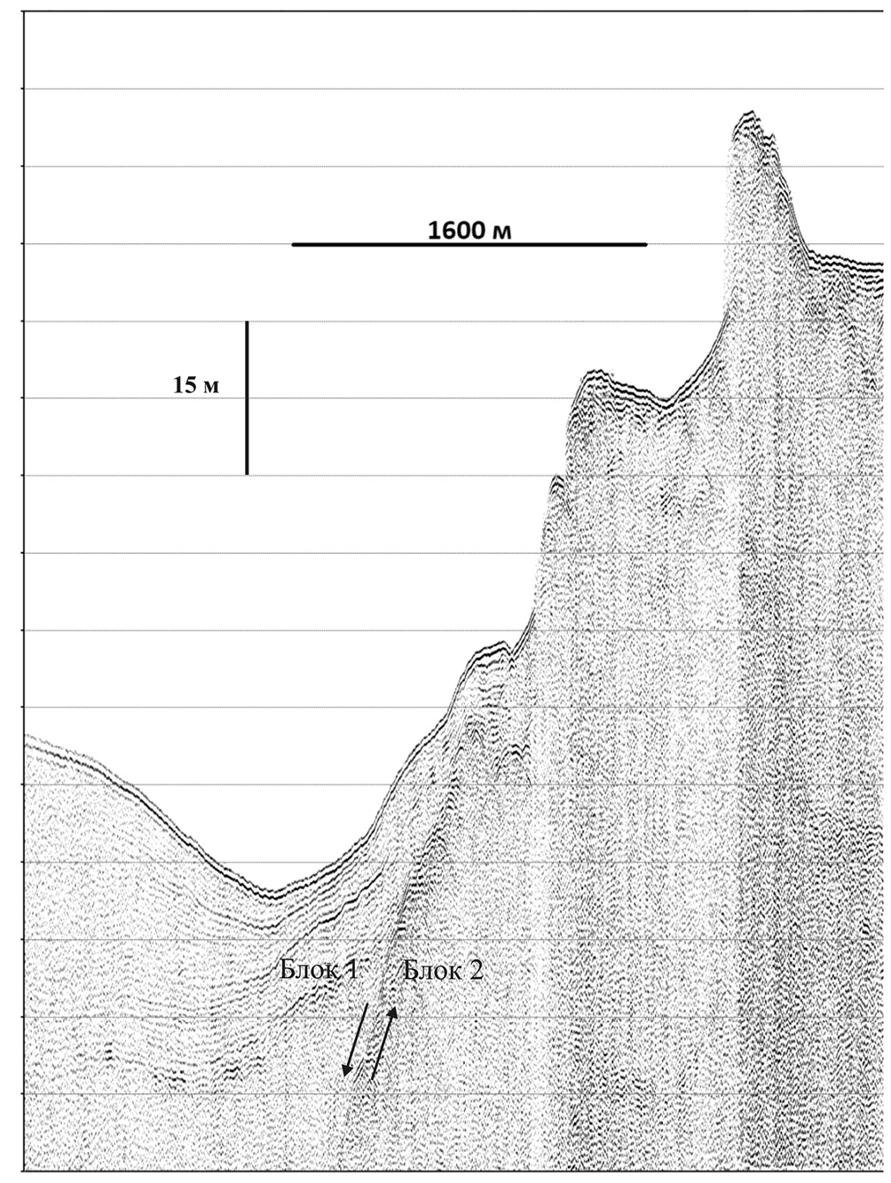 На профиле НСП (см. рис. 7) выделяется дислокация (возможно палеосейсмодислокация в соответствии с [22]) на временах 84–86 мс, что соответствует глубине порядка 63 м от поверхности моря и порядка 15 м от морского дна. Возможная палеосейсмодислокация представлена в виде ступеньки (разлома), смещающей границу между слоями осадочных пород в четвертичных отложениях на величину порядка 5 м.
