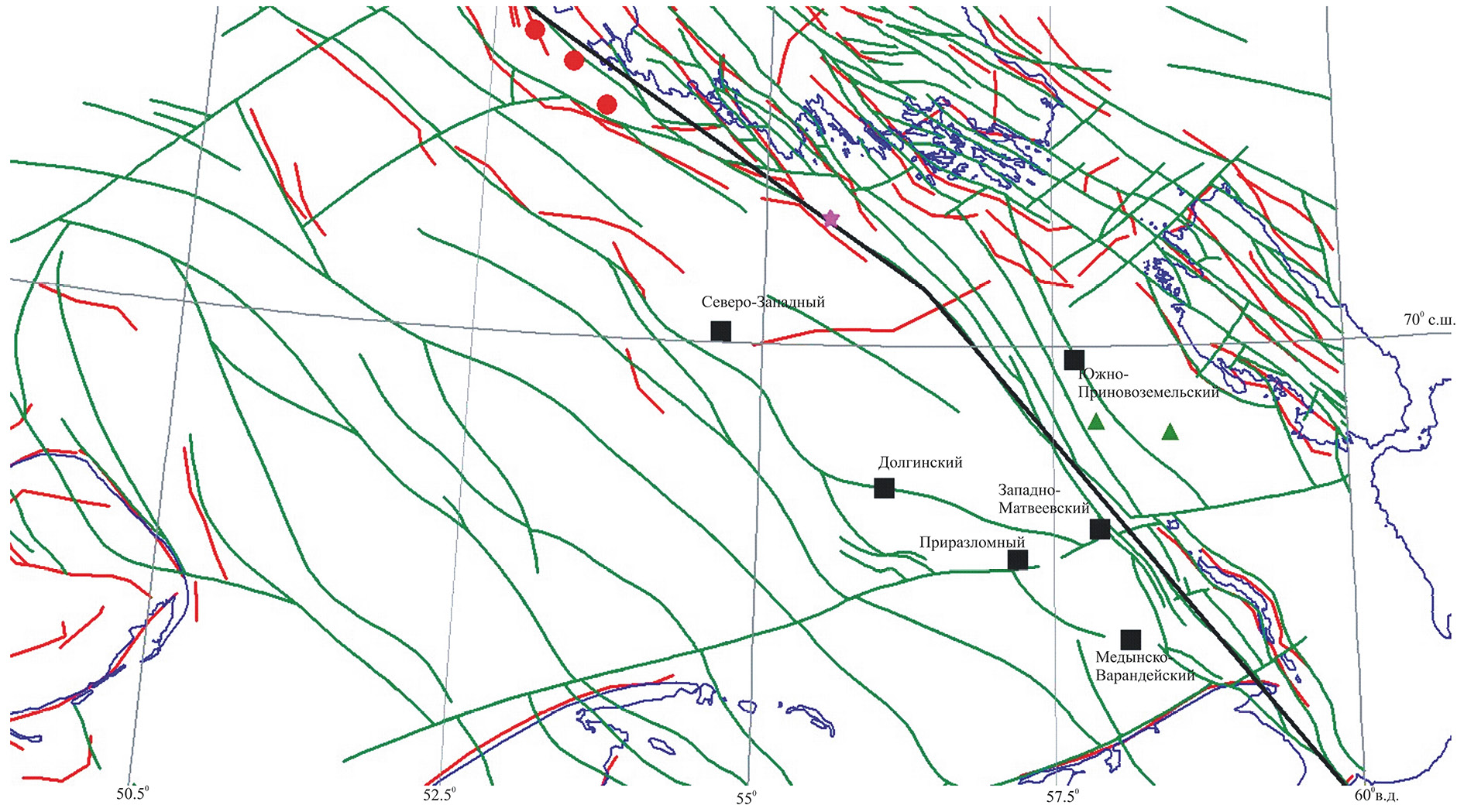 Рис. 6. Положение разломов северо-восточного шельфа Печорского моря, из работы [3]. Красные кружки — эпицентры тектонических землетрясений, индуцированных ядерным взрывом на архипелаге Новая Земля, по данным Геологической службы США [35], черные квадратики — нефтегазовые месторождения, зеленые линии — разломы, по данным [3], красные линии — разломы, по данным линеаментного анализа, черная линия — Североуральский линеамент, сиреневая звездочка — положение обнаруженной палеосейсмодислокации