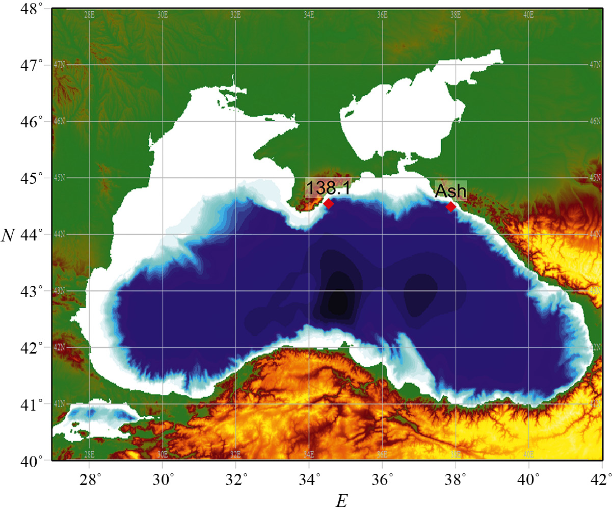 Рис. 1. Места расположения станций Ash (44.489° с.ш., 37.870° в.д.) и 138.1 (44.543° с.ш., 34.533° в.д.)