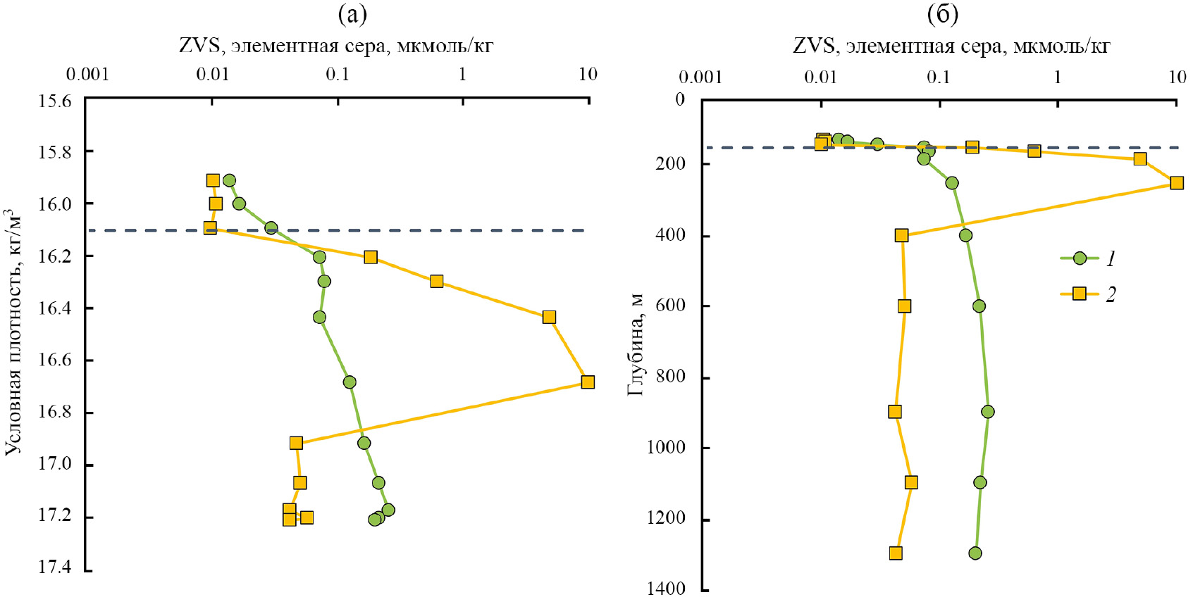Рис. 5. Изменение концентраций ZVS (1) и элементной серы (S0) (2) в воде Черного моря на станции 138.1 (7 октября 2022 г.) относительно плотности (а) и глубины моря (б). Пунктиром показан редокс интерфейс