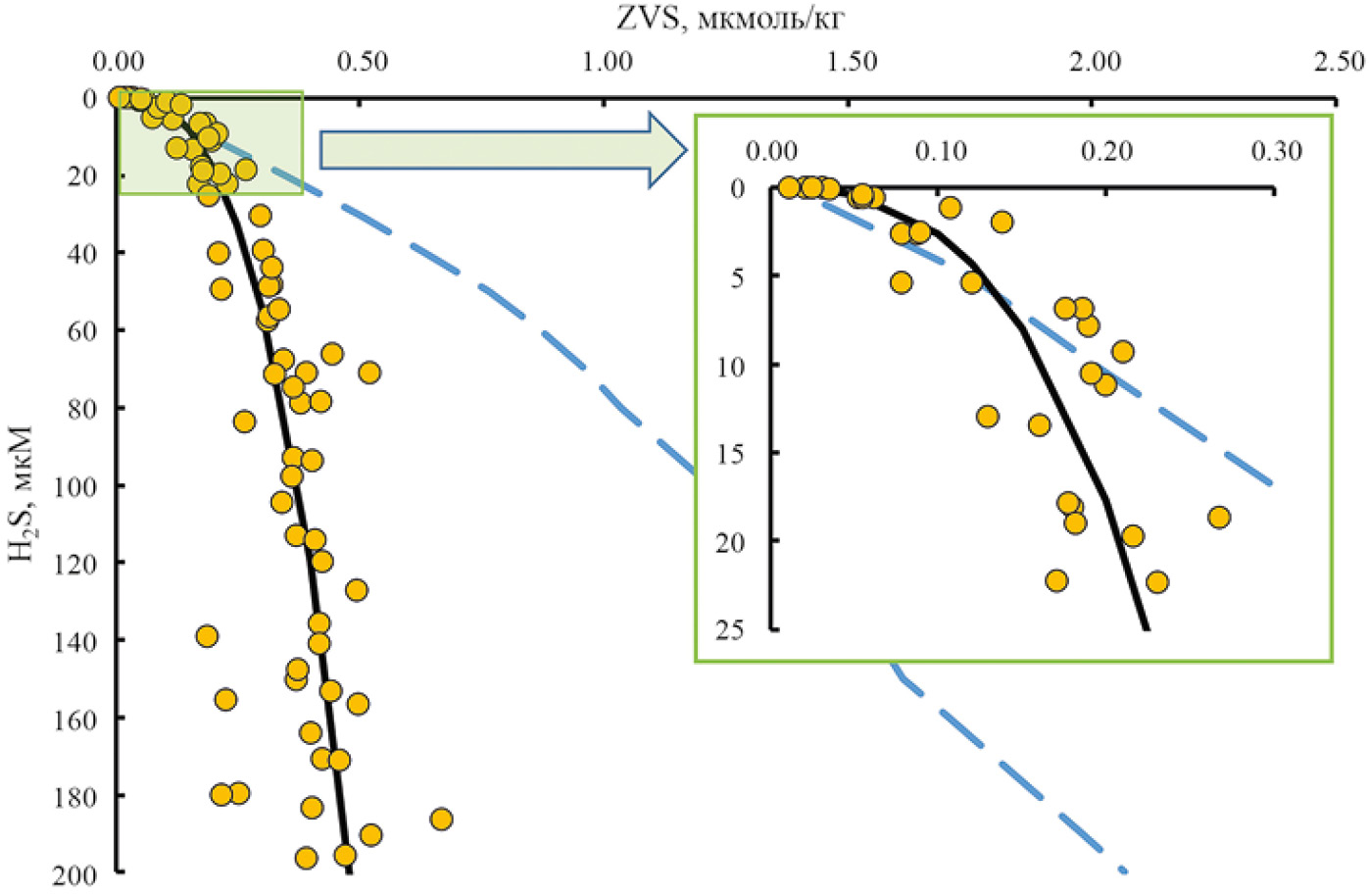 Рис. 7. Распределение концентраций ZVS с увеличением сероводорода с глубиной водной толщи (до 600 м) в анаэробной зоне Черного моря. Черной линией показана эмпирическая зависимость [H2S] = 1490.18 × [ZVS]2.75, R2 = 0.894. Синий пунктир — расчетное количество полисульфидов по термодинамическим данным (детали приведены в тексте). На вставке — распределение ZVS в зависимости от H2S в верхней части анаэробной зоны