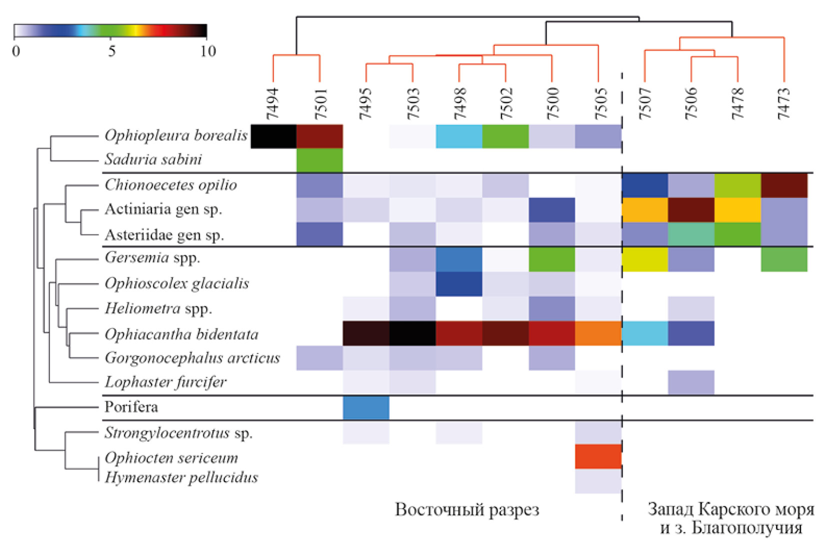 Ранее в этом районе были описаны богатые сообщества с доминированием офиур Ophiacantha bidentata и ряда других подвижных сестонофагов [6, 14, 30]. Достаточно большая доля сестонофагов в северных районах, располагающихся на склоне Северной Земли, отмечена также при исследовании желоба Воронина [3]. При этом авторы показывают, что глубины бровки шельфа (порядка 240 м) оказываются очень богатыми количественно и по биомассе превышают биомассу бентоса на шельфе Карского моря в целом, включая его южные районы. Наши данные подтверждают этот факт, самой богатой станцией количественно оказалась станция верхней части склона на глубине 450 м, сообщество мегабентоса на большей части шельфа также можно охарактеризовать как сообщество Ophiacantha bidentata и сестонофагов.