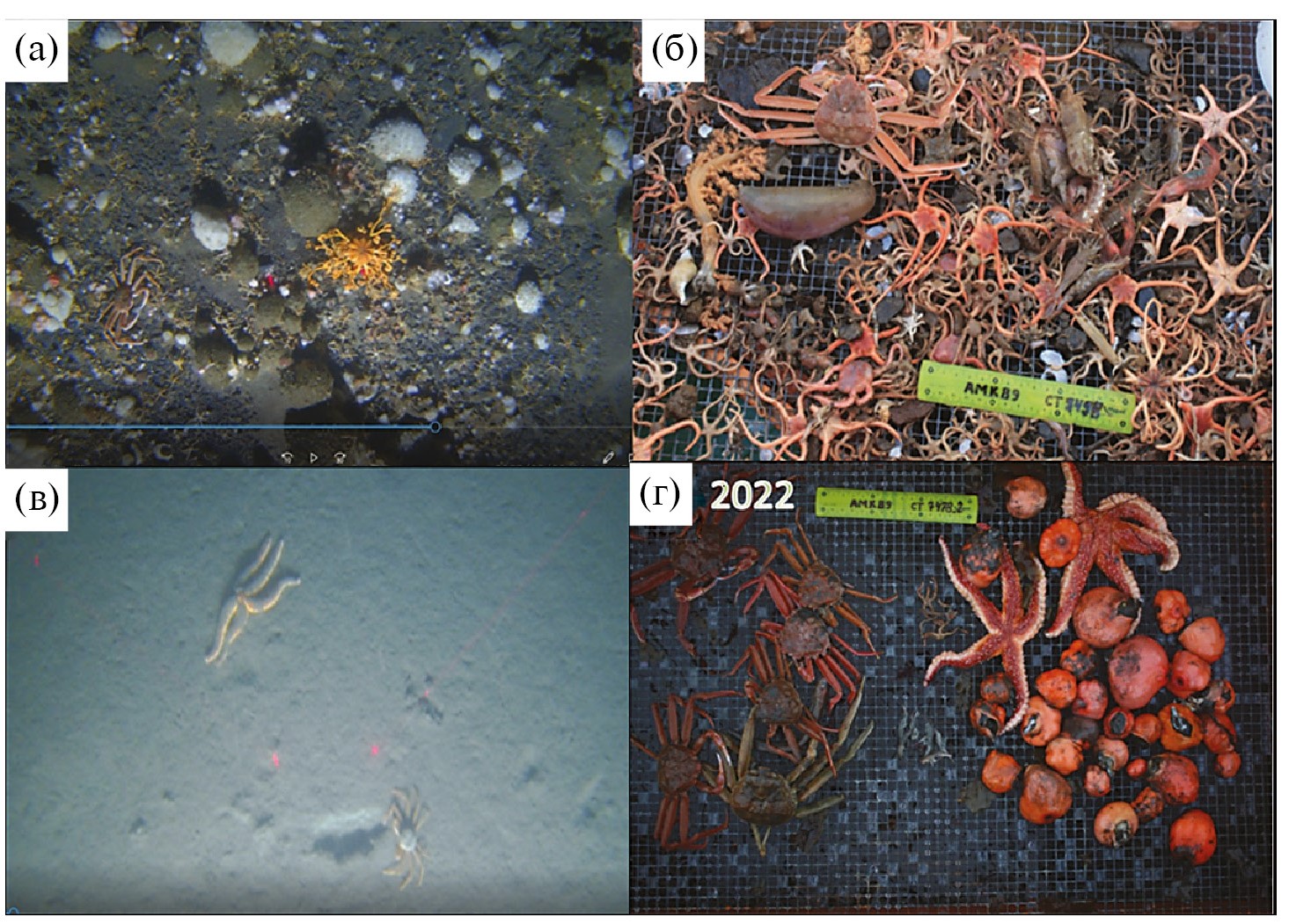 Рис. 2. Характерные фрагменты видео треков и уловов трала из северо-восточного района (ст. 7498, а) и б) соответственно) Карского моря и залива Благополучия (ст. 7478, в) и г) соответственно).