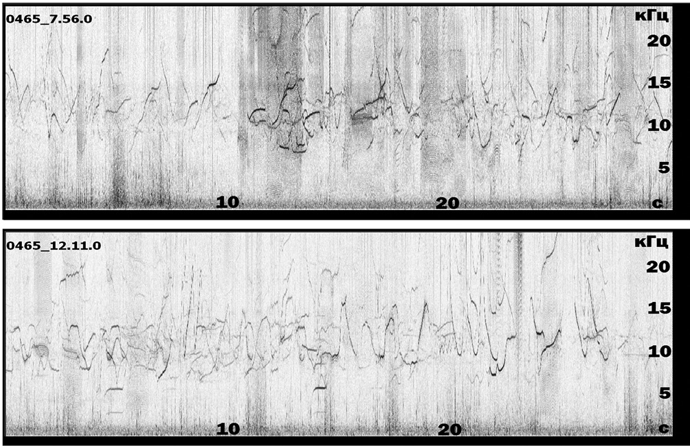 Белобочки продуцировали сигналы весьма интенсивно (до 100 сигналов в минуту) во всех сделанных записях. Судя по наложению сигналов (в том числе – и однотипных) на спектрограммах, они продуцировались одновременно несколькими особями в виде непрерывного хаотичного потока.
