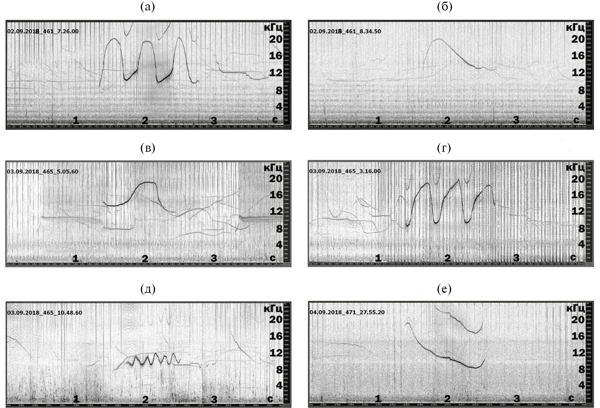 - Отсутствуют или крайне редки наложения сходных типов сигналов на спектрограммах (что свидетельствует о том, что определенные типы продуцируются преимущественно конкретными особями).