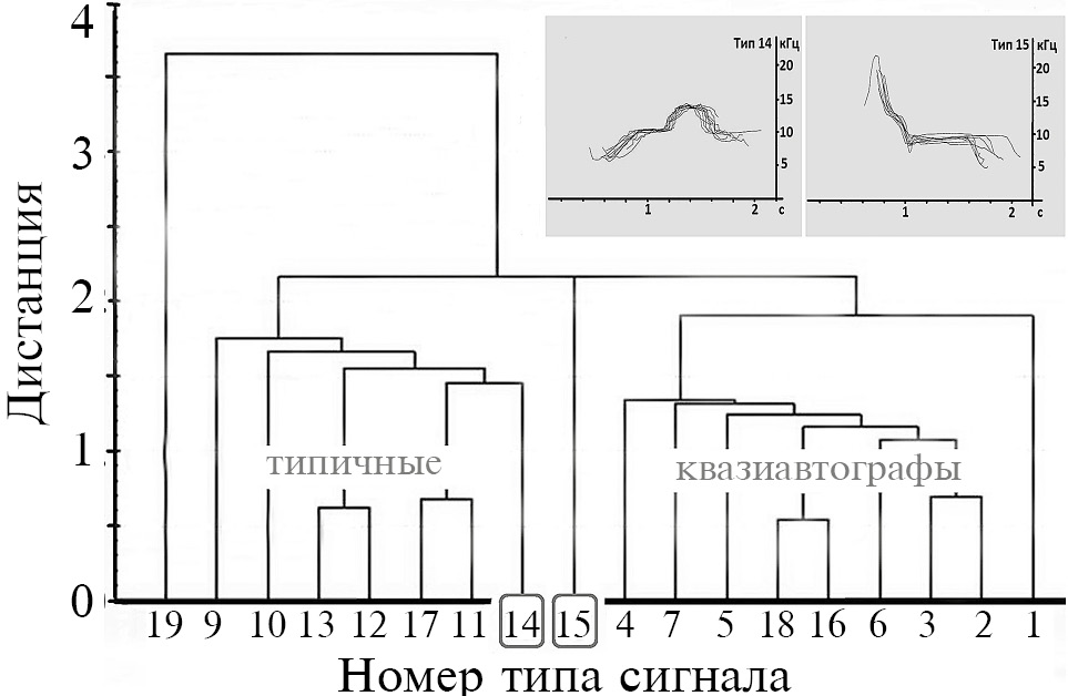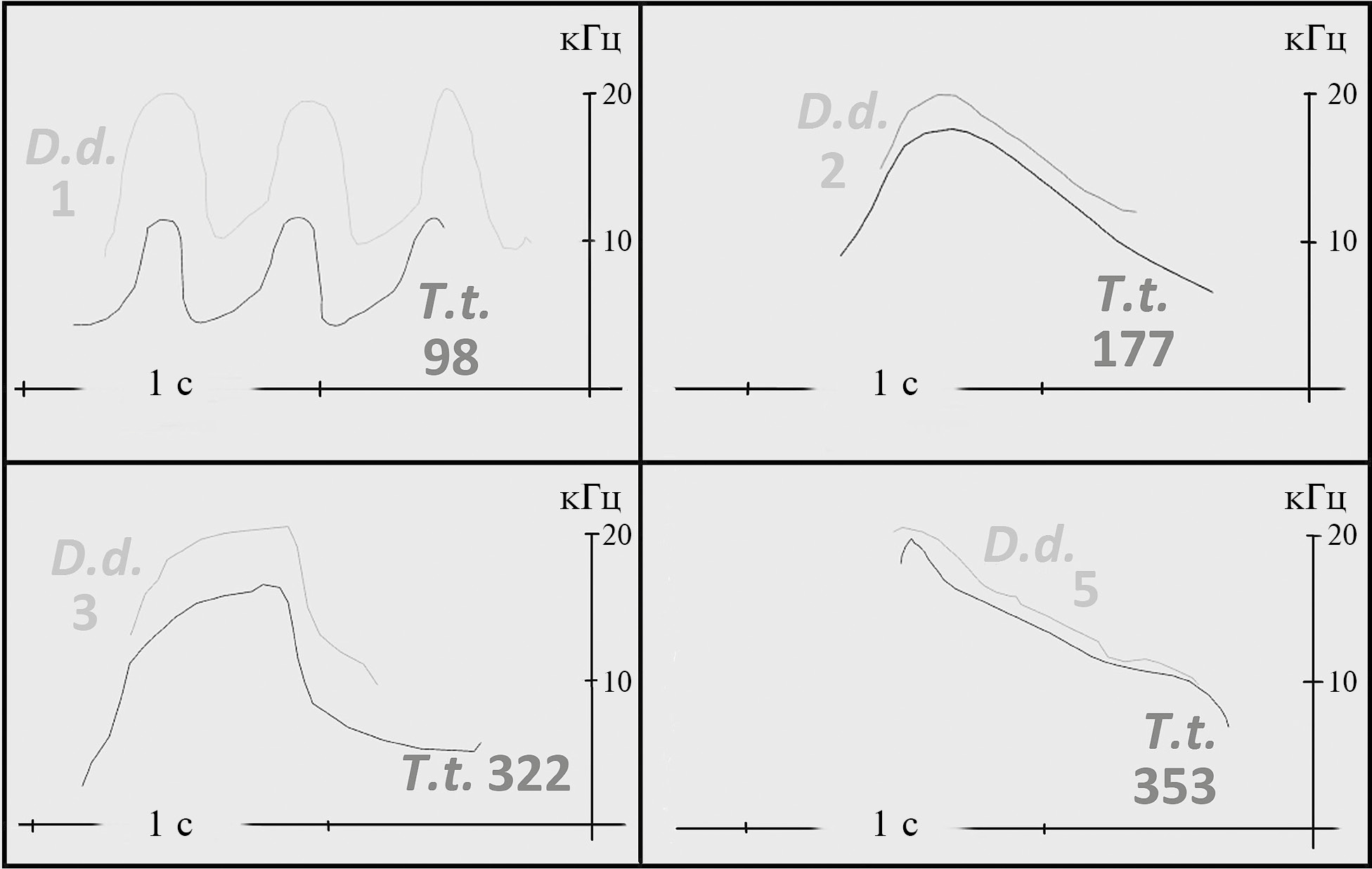 Поскольку в ходе сравнительного анализа были выявлены существенные структурные различия двух подкатегорий свистов белобочек, методологически корректным являлось сравнение “автографов” афалин со свистами белобочек 2-й категории (квазиавтографами). Так, на основании визуального сравнения сигналов были выявлены “автографы” афалин, контуры которых практически идентичны типам 1, 2, 3 и 5 свистов белобочек (рис. 11); при этом следует отметить, что свисты белобочек продуцируются в несколько более высокочастотном диапазоне, чем “автографы” афалин.