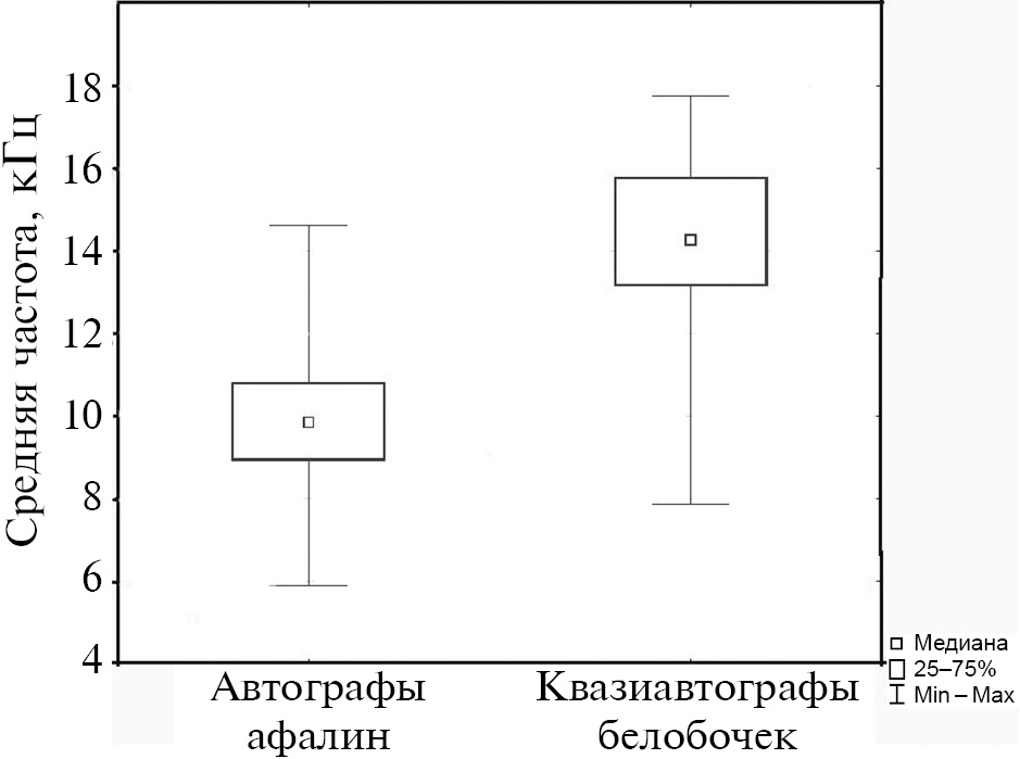 Значимые различия в распределении средних частот сигналов были выявлены при помощи критерия Манна–Уитни (Mann–Whitney U Test, p < 0.05), диаграммы размаха показаны на рис. 12.