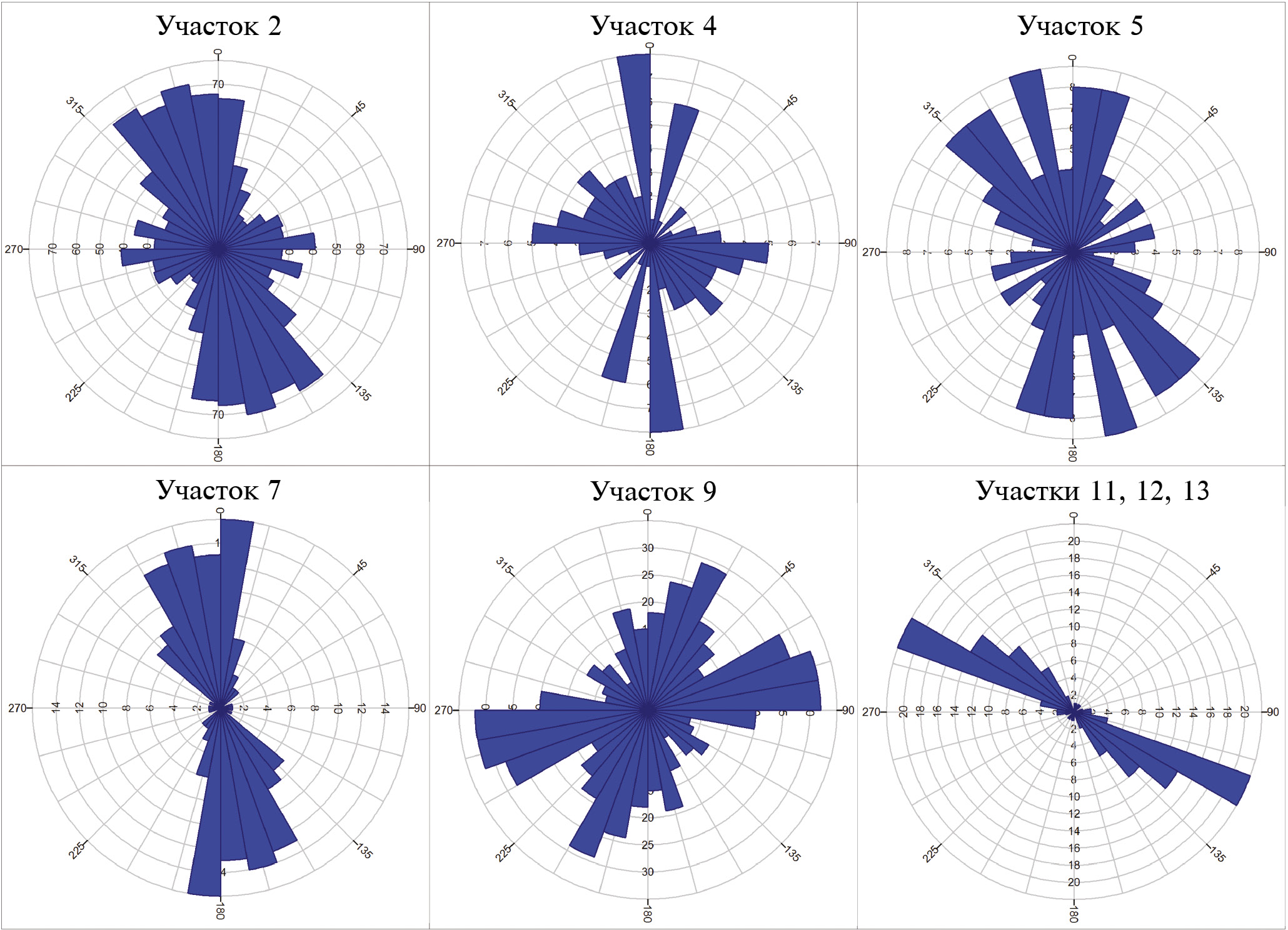 Основным направлением борозд выпахивания в юго-западной части Карского моря является субмеридиональное, особенно сильно это выражено для крупных борозд (рис. 8). Другой выраженный пик направлений борозд – субширотный. Однако, эти направления не являются подавляющими, множество борозд имеют промежуточные азимуты, и, в целом, в этом компоненте распределены довольно равномерно. Зависимости между направлением борозд и их статистическими параметрами (глубиной, шириной и глубиной моря) не выявлено. Как правило, борозды имеют несколько сегментов с различными направлениями, реже плавно изгибаются. Существенная часть борозд прямолинейная. Борозды меняют направление на угол от нескольких градусов до 150–160°.