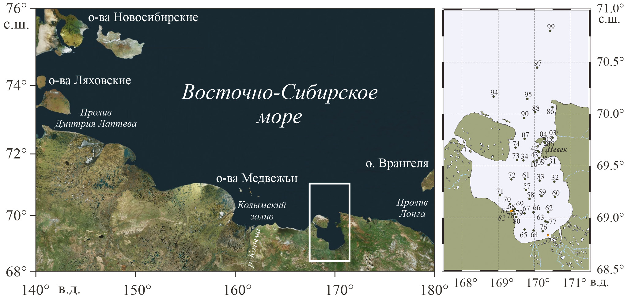 Рис. 1. Карта-схема района исследований. Справа приведена схема расположения станций отбора проб донных осадков.