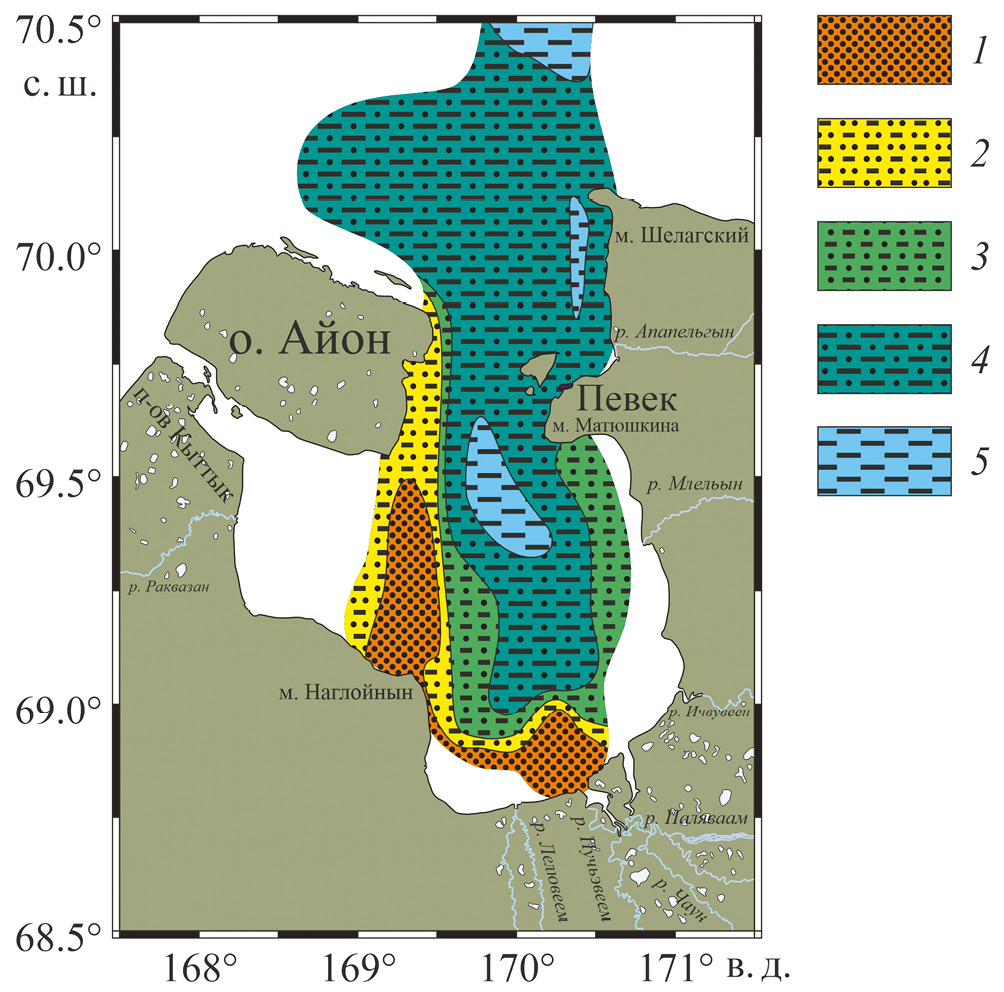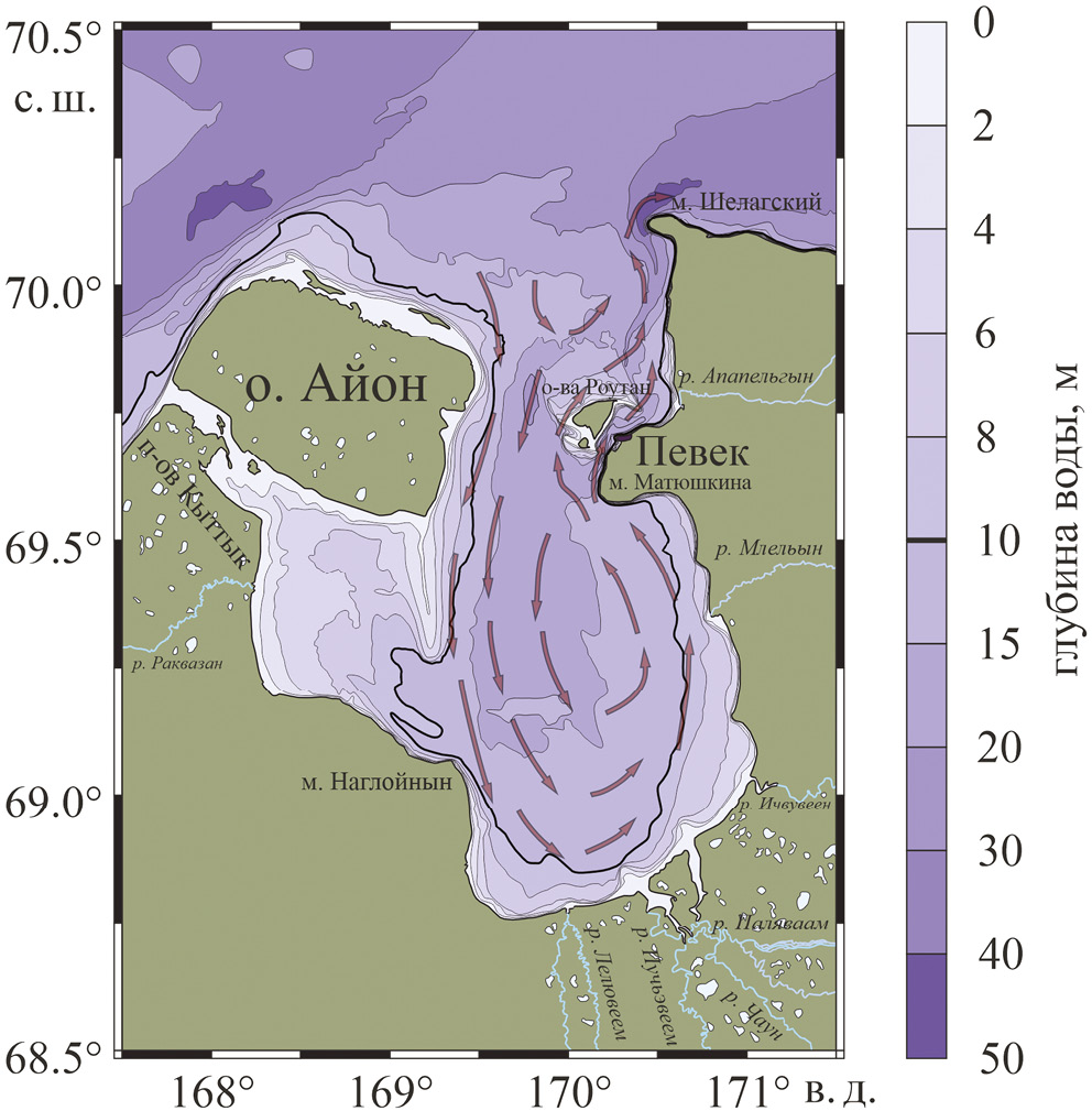 Полигонально-тундровый ландшафт развит с западной (о. Айон и п-ов Кыттык) и южной (устьевая часть рек Чаун, Паляваам, Пучьэвеем, Лелювеем) сторон, где сосредоточены многочисленные термокарстовые озера, аласы и мелкие реки. Западный берег низменный, восточный – более возвышенный. В рельефе дна выражены конусы выноса, наиболее крупные из которых сформированы реками Чаун, Паляваам, Ичвувеен, Лелювеем, Млельын, Апапельгын, впадающими в южную, юго-восточную и восточную части губы. Средняя глубина акватории не превышает 20 м, максимальная отметка (31 м) зафиксирована в проливе Певек (рис. 2). По данным [4] состав осадочного вещества в Чаунской губе в значительной степени определяется гравитационными потоками поступающего с суши терригенного материала – продуктов термоабразии береговой зоны (о. Айон) и речного стока.