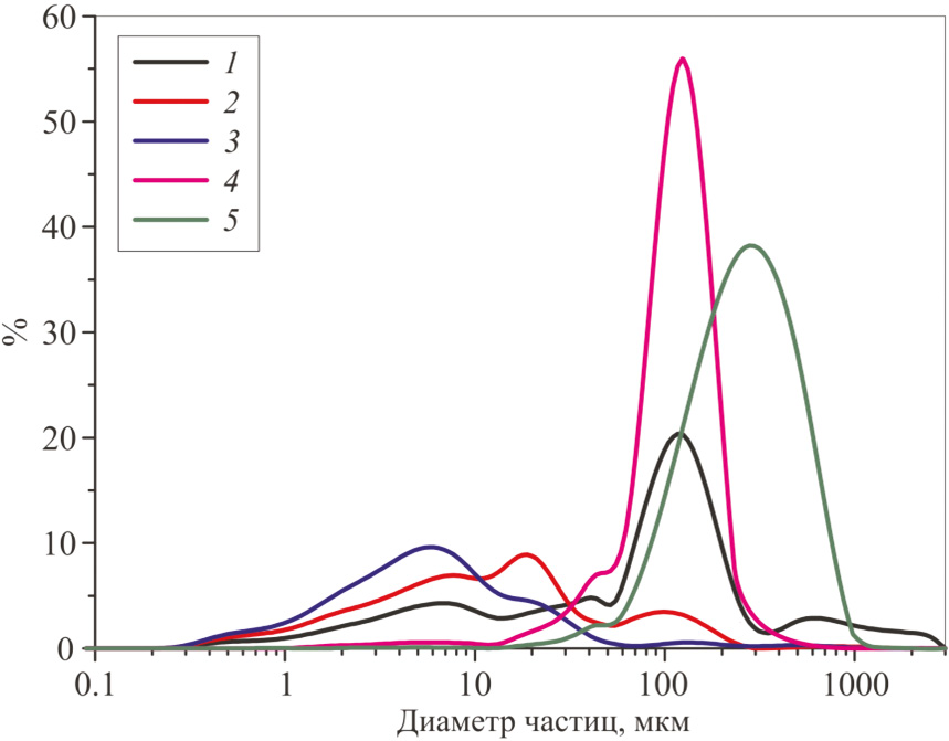 Рис. 3. Примеры размерных распределений частиц в донных осадках Чаунской губы разного литологического описания. 1 – ст. 03, гор. 0–2 см (алевритовый ил); 2 – ст. 10, гор. 0–2 см (алеврито-пелитовый ил); 3 – ст. 61, гор. 0–1 см (пелитовый ил); 4 – ст. 74, гор. 0–2 см (песок заиленный); 5 – ст. 76, гор. 0–3 см (песок).