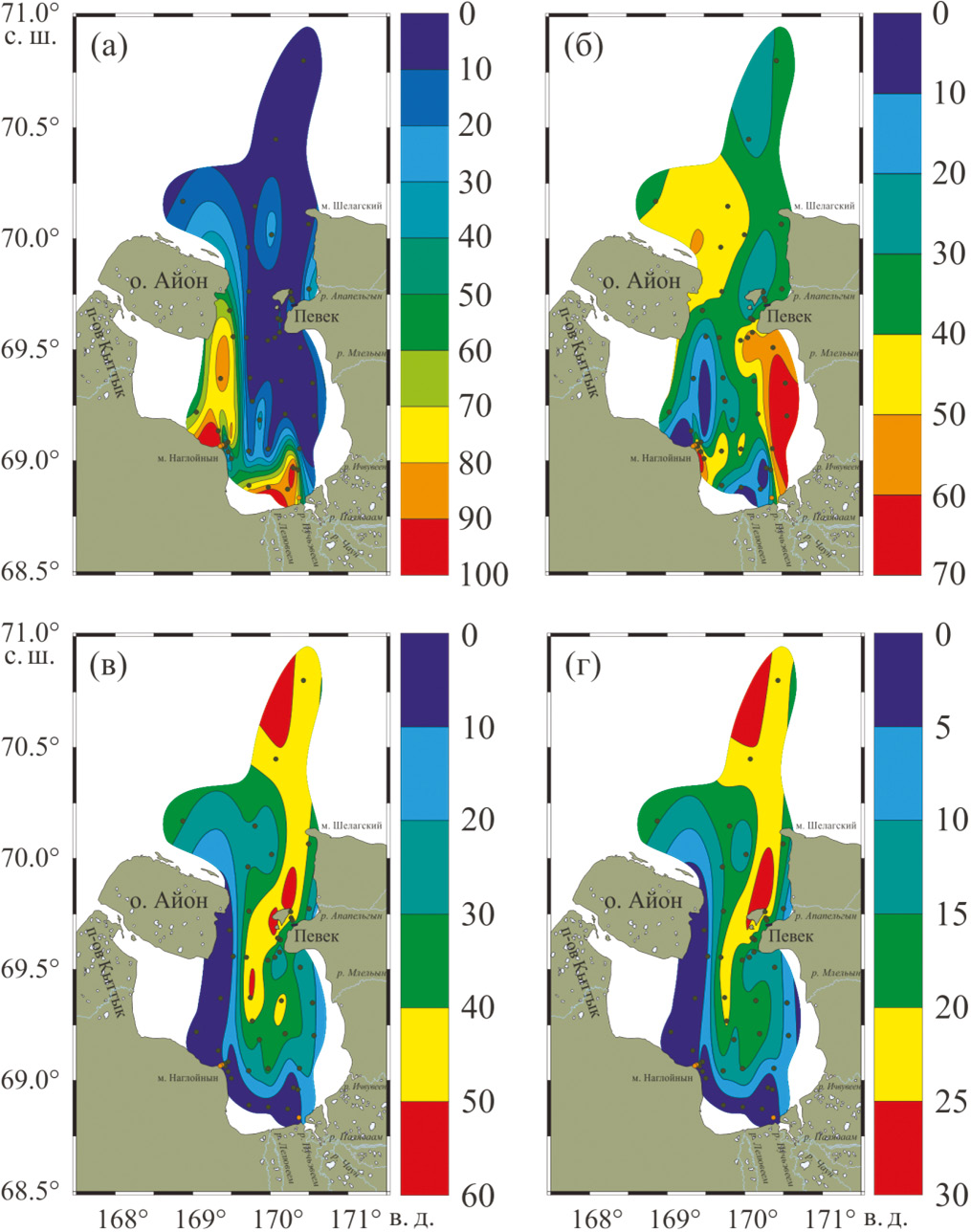Рис. 4. Карты-схемы пространственного распределения массовой доли (в %) гранулометрических фракций в поверхностном (окисленном) слое осадков: а – фракция >63 мкм; б – фракция 10–63 мкм; в – фракция 2–10 мкм; г – фракция <2 мкм.