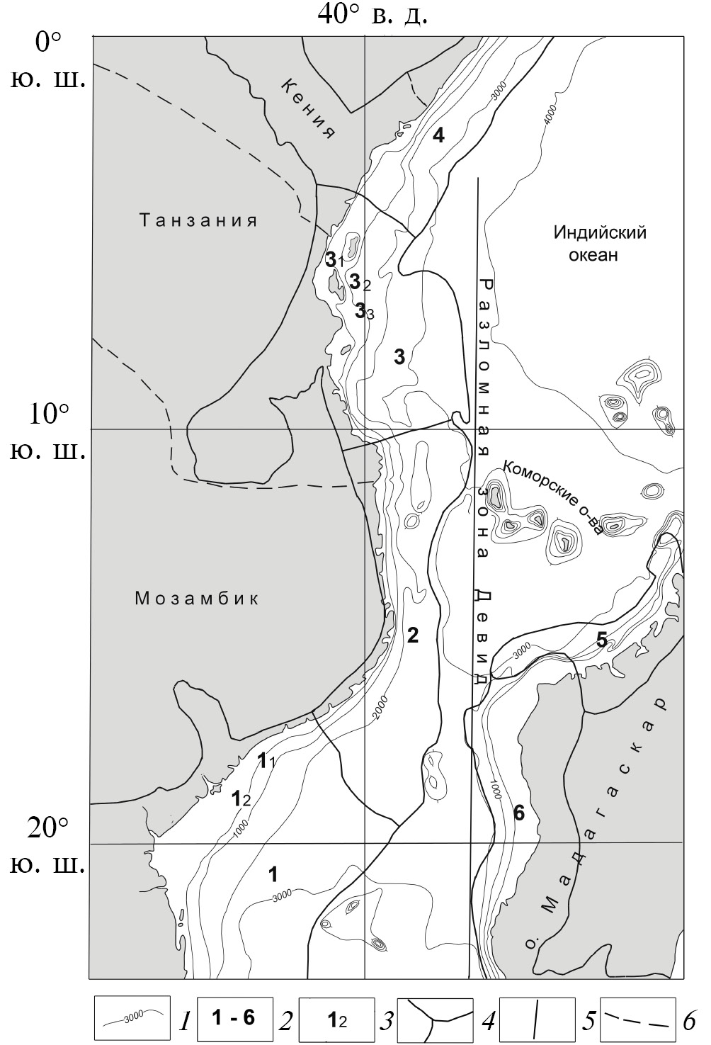 Рис. 1. Схематическая карта размещения осадочных бассейнов и суббассейнов на континентальной окраине Юго-Восточной Африки (с использованием материалов [5, 7, 12, 24, 25]. 1 – Изобаты; 2 – названия осадочных бассейнов на континентальной окраине: 1 – Мозамбикский, 2 – Ровума, 3 – Танзанийский, 4 – Ламу, 5 – Маджунга, 6 – Морандова; 3 – названия суббассейнов на континентальной окраине: 11 –Ангош, 12 –Замбези, 31 – Руву, 32 – Мафия, 33 – Мандава; 4 – граница бассейнов; 5 – зона разлома; 6 – государственные границы.