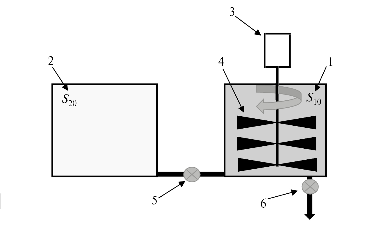 Рис. 2. Двухбаковая система для заливки линейно стратифицированной жидкости. 1 – правый бак с начальным раствором воды с нулевой соленостью S10 = 0, 2 – левый бак с водой c соленостью S20, 3 – электромотор, 4 – мешалка, 5 – кран с трубкой, соединяющей баки, 6 – кран с трубкой, соединяющей правый бак с бассейном.