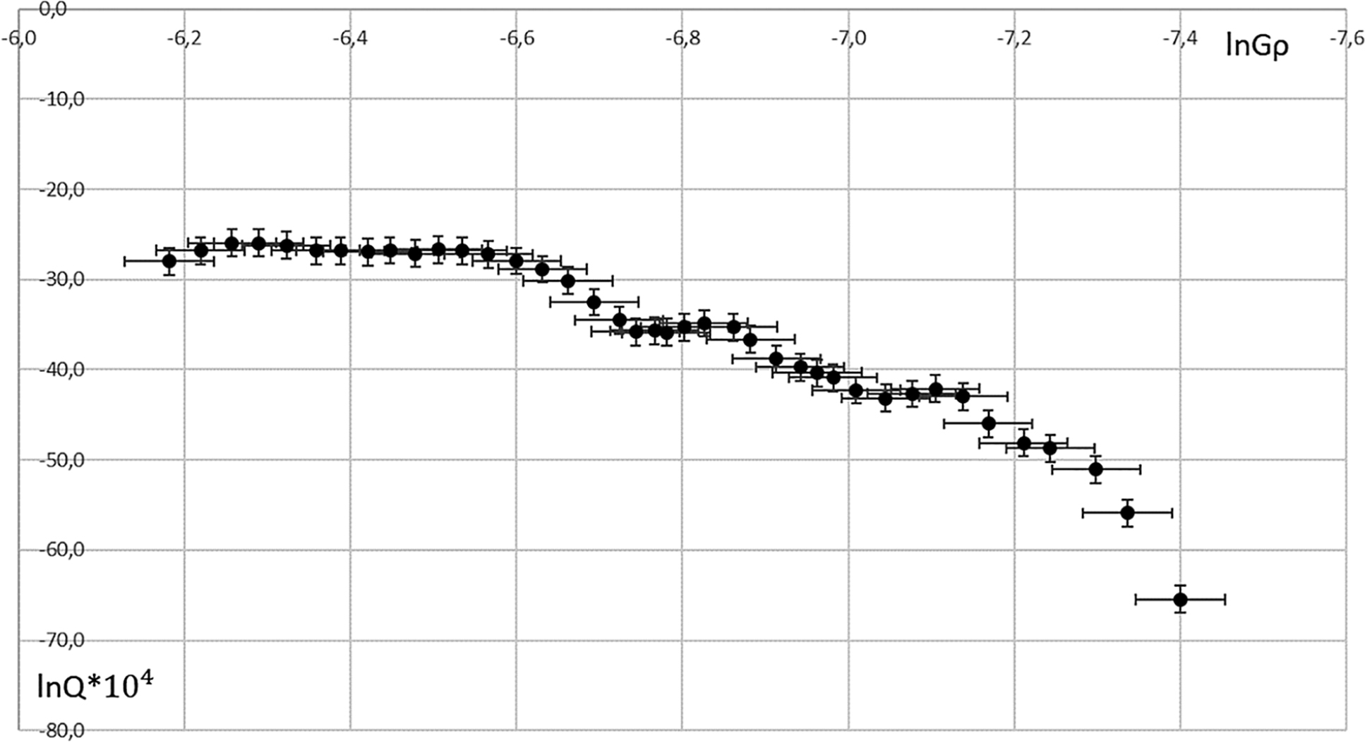 Рис. 5. Зависимость логарифма модуля потока массы Q от логарифма градиента плотности Gρ. Опыт с начальными значениями Ri0 = 13, Re = 115. Зоны, выделенные различными оттенками серого, соответствуют различному количеству высокоградиентных прослоек: 3, 2 и 1.