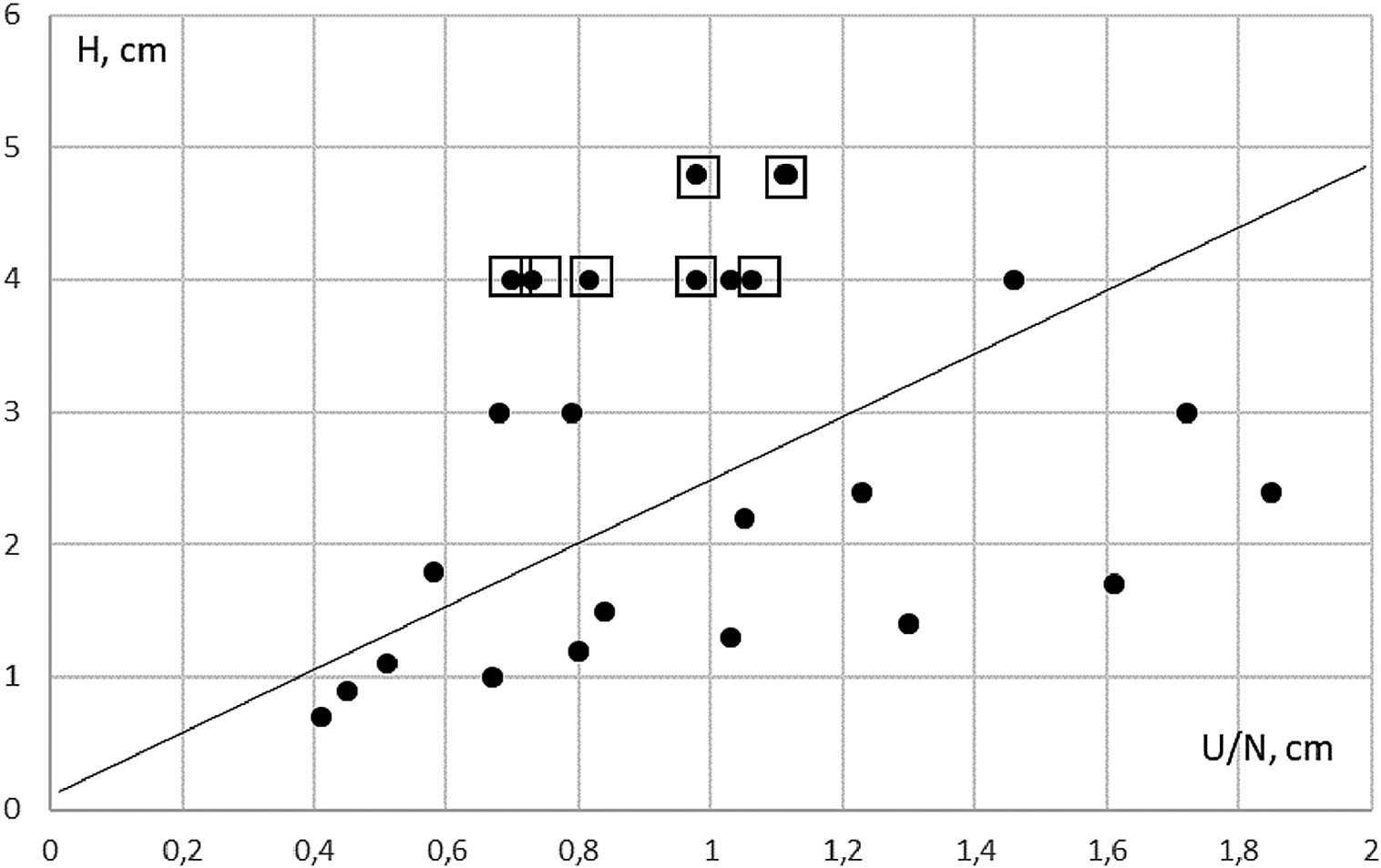 По данным, полученным в опытах, была оценена толщина промежуточных квазиоднородных слоев в зависимости от комбинации двух определяющих параметров: U и N = [(g/ρ)∂ρ/∂z]0.5 – частота Вяйсяля–Брента. Из этих параметров можно составить один параметр, имеющий размерность длины: U/N. Физический смысл этого параметра заключается в балансе генерации турбулентности движением стержней (числитель) и в ее подавлении плотностной стратификации (знаменатель). Для океанской среды впервые подобный параметр был введен Р.В. Озмидовым [5] как масштаб турбулентного перемешивания в устойчиво стратифицированной жидкости. Очевидно, что для образования ступенчатой структуры в изначально непрерывно стратифицированном водном слое при однородном турбулентном воздействии должно выполняться условие H<<H0, где H ~ U/N – толщина формирующегося квазиоднородного слоя, а H0 – толщина всего стратифицированного слоя.