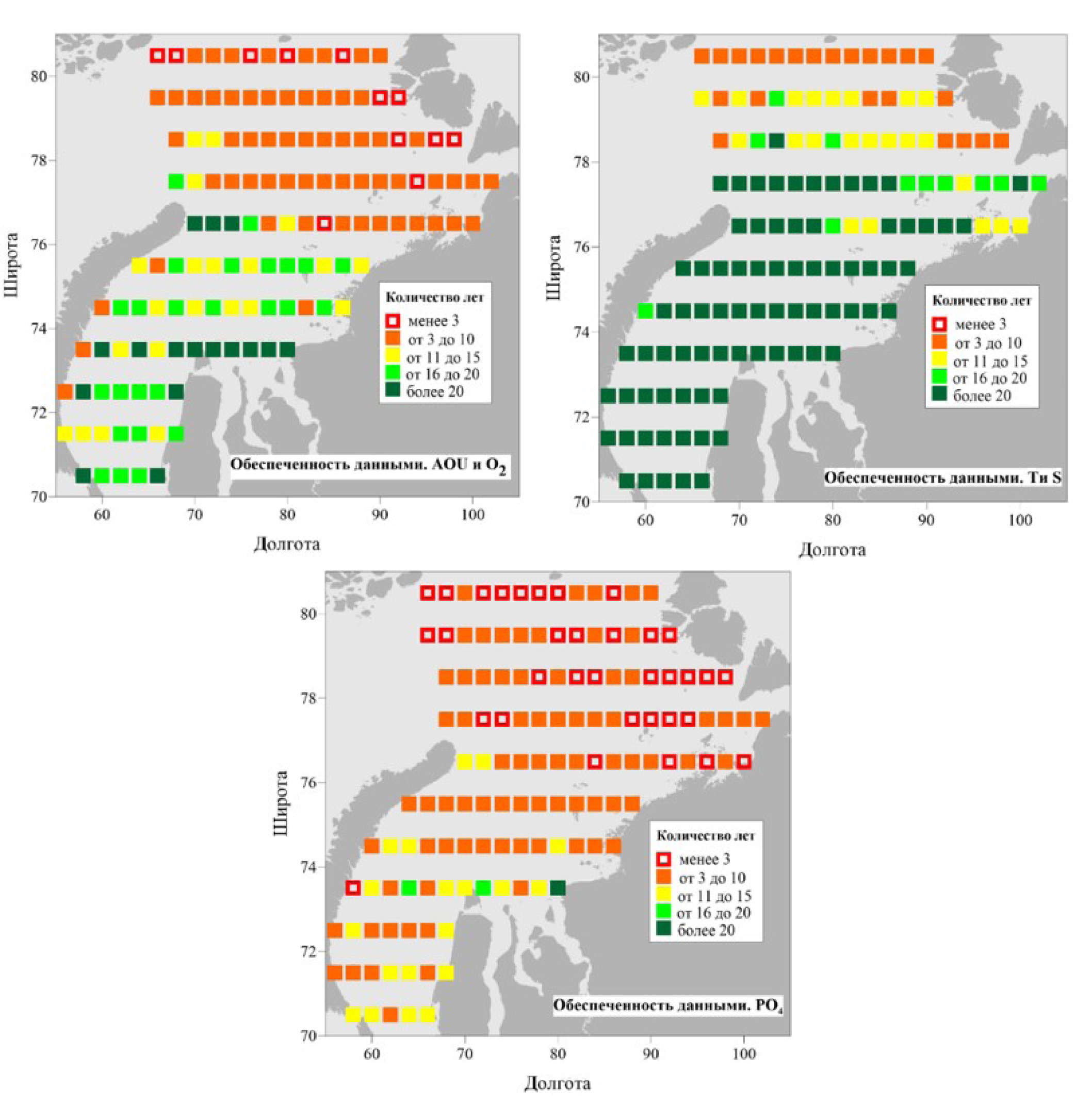 Как видно из таблицы обеспеченности гидрофизическими и гидрохимическими данными, большинство наблюдений было проведено в летний период (табл. 2). Карское море в наибольшем объеме обеспечено данными по температуре и солености. Однако для летнего сезона имеются данные по гидрохимии (O2, AOU, Si, pH, PO4) с широким пространственно-временным охватом, что позволяет использовать гидрохимические параметры для проведения районирования.