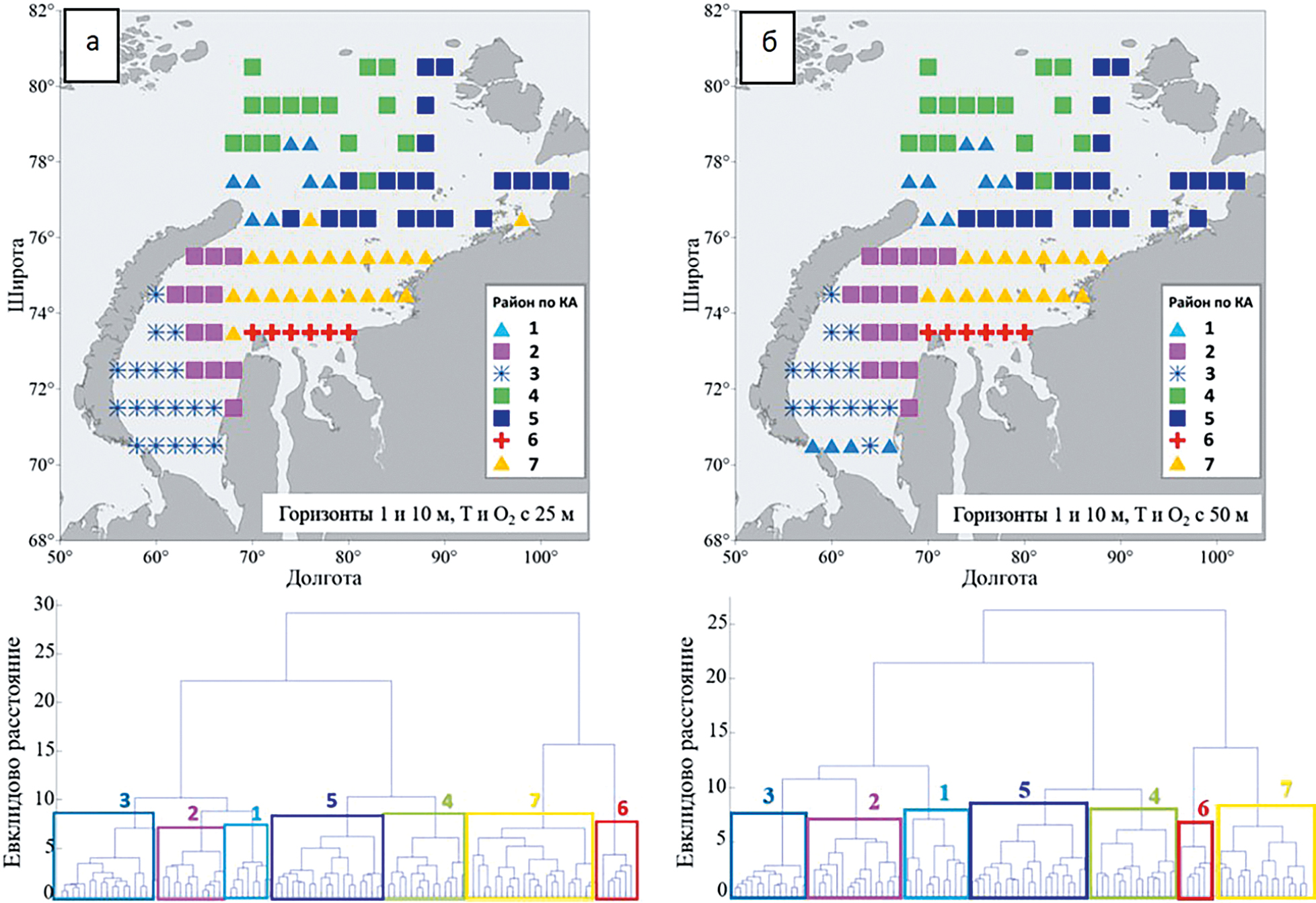 Рис. 3. Районирование Карского моря (вверху) и дендрограммы (внизу) по результатам кластерного анализа: (а) для горизонтов 1, 10 м (S, T, O2, AOU и PO4) и 25 м (S, T, O2); (б) для горизонтов 1, 10 (S, T, O2, AOU и PO4) и 50 м (T и O2).