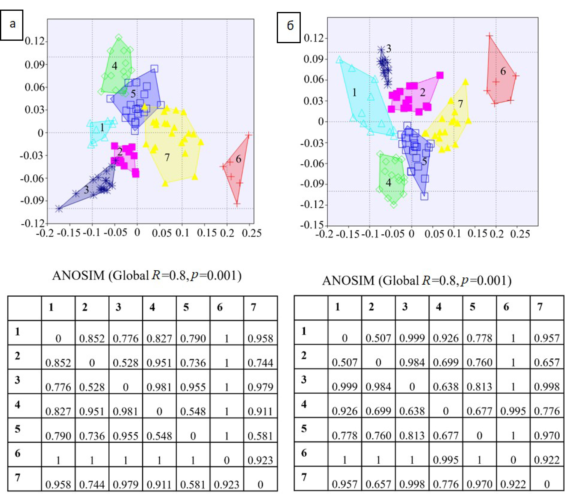 Проверка статистической значимости полученных группировок выполнялась анализом сходства ANOSIM. Эта непараметрическая процедура проверяет, являются ли различия между двумя или более группами значимыми (неслучайными) на основе выбранной меры расстояния. Она сравнивает ранги расстояний между группами с рангами расстояний внутри групп. На основе средних значений этих двух типов рангов формируется итоговая статистическая мера R, изменяющаяся в интервале [–1; 1]. Значение R, близкое к 1, подтверждает различие между группами, тогда как значение R, близкое к 0, говорит об отсутствии существенных различий между группами. Если значения R ниже 0, то различия внутри групп больше, чем между группами. Кроме того, рассчитывается достоверность полученной статистики R (уровень значимости p или p-value). Результат считается значимым при p ≤ 0.05, R > 0.1 [16].