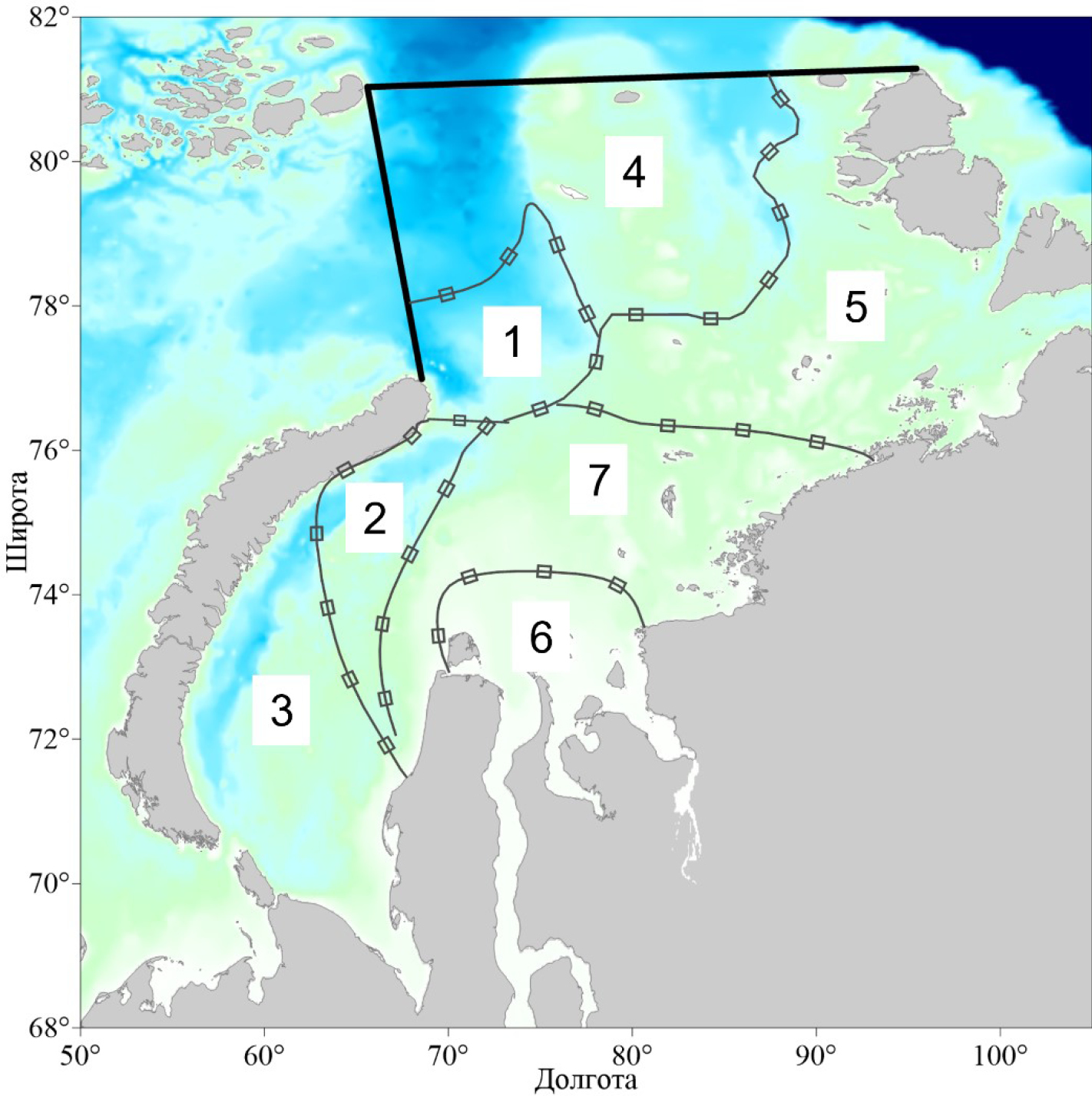Рис. 5. Районирование Карского моря на основе результатов кластерного анализа. Цифрами показаны следующие районы: 1 – район желоба Св. Анны; 2 – Северо-Новоземельский; 3 – Юго-Западный; 4 – Северный; 5 – Восточный; 6 – Приэстуарный; 7 – Центральный.