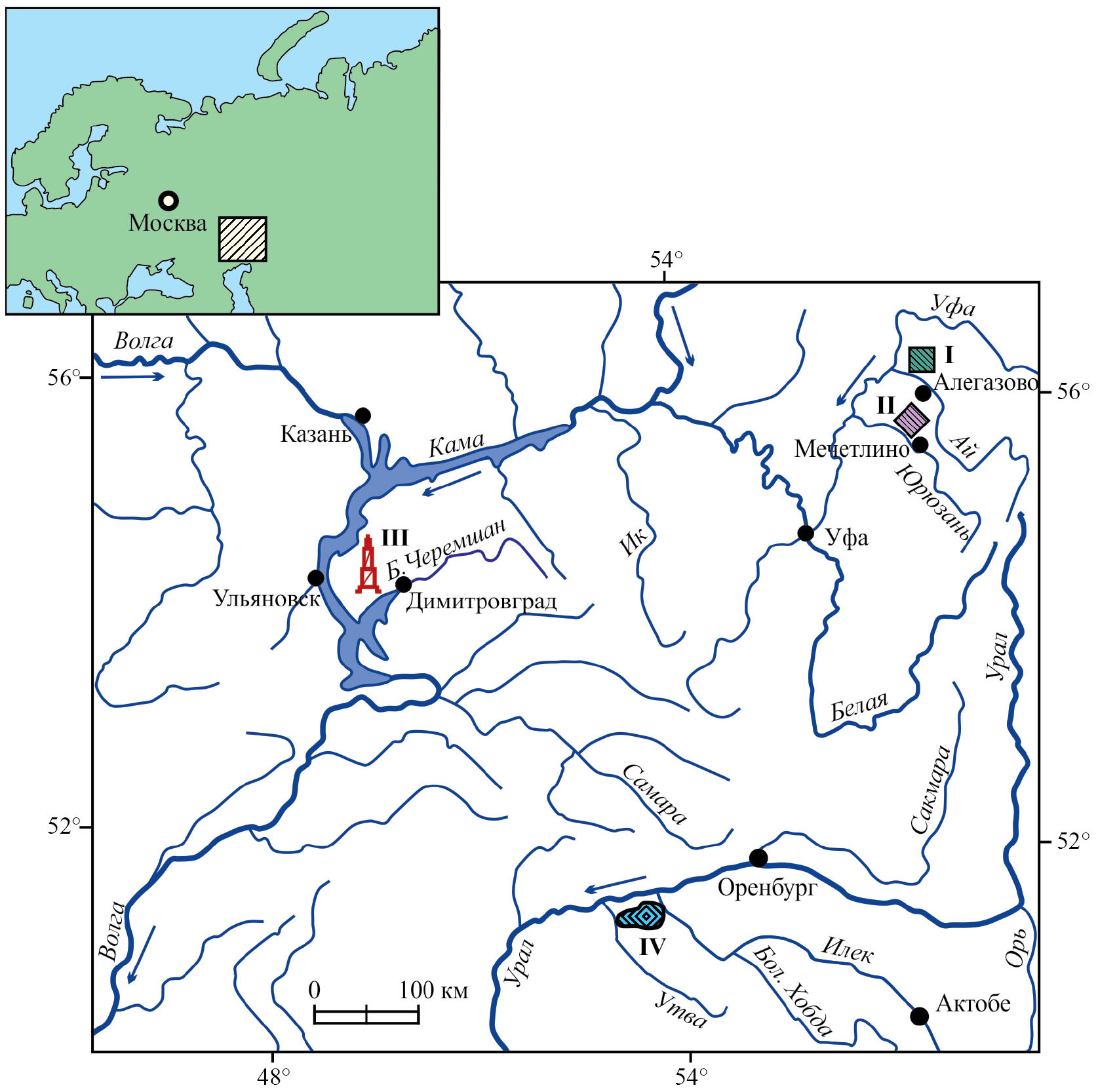 Рис. 1. Местонахождения радиолярий кунгура на Южном Урале (I и II), раннего турне в Волго-Уральском (III) и Прикаспийском (IV) бассейнах: I – р. Ай, с. Алегазово, разрез Алегазово (Kozur, Mostler, 1989); II – р. Юрюзань, с. Мечетлино, разрез Мечетлино (Chernykh et al., 2022; Афанасьева, 2023а; Afanasieva, 2023); III – скважина Мелекесская-1 (Афанасьева, 2022a, 2022б, 2023б; Afanasieva et al., 2023; Фортунатова и др., 2023); IV – массив Карачаганак (Афанасьева, 1987, 2000).