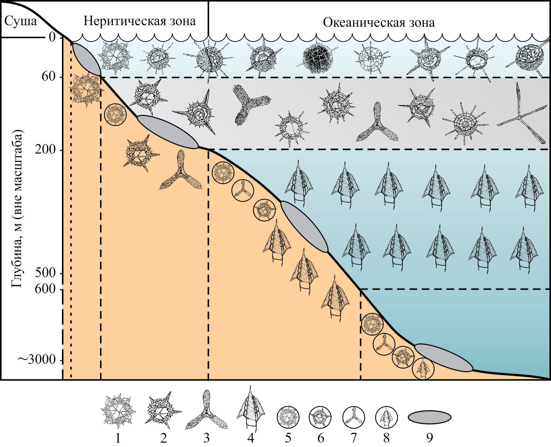 (1) экозона – это слои, в которых комплекс остатков организмов (в данном случае радиолярий) отражает их прижизненную экологическую ассоциацию или тафономические особенности ориктоценоза;