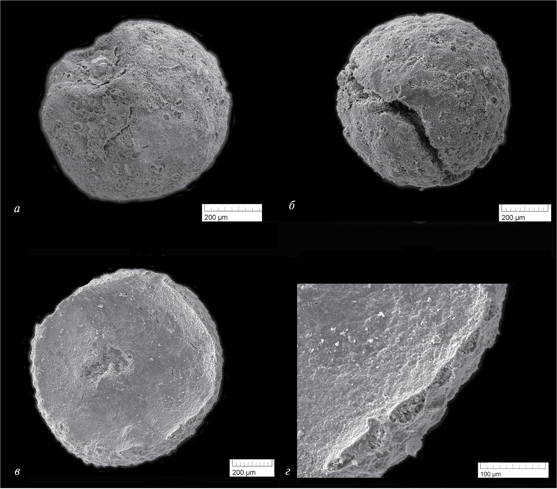 Микрофоссилии для исследования извлекались из вмещающих пород по стандартной методике растворения в 10%-м р-ре уксусной кислоты (Методика…, 1973; Физические…, 1988). Из полученных порошков материал отбирался вручную под микроскопом МБС-9. Далее фоссилии наклеивались на столики ровными рядами с помощью углеродного скотча. Сначала ископаемый материал изучался и фотографировался в отраженном свете на микроскопе Leica N-165 C. Затем столики напылялись золотом или сплавом золота и палладия для исследования на сканирующих электронных микроскопах Tescan Vega II (Brno, Czech Republic) и EVO-50 Zeiss c микроанализатором INCA Oxford 350 (Лондон) при 15–20 кВ с применением EDX (энергодисперсионного рентгеновского микроанализа).