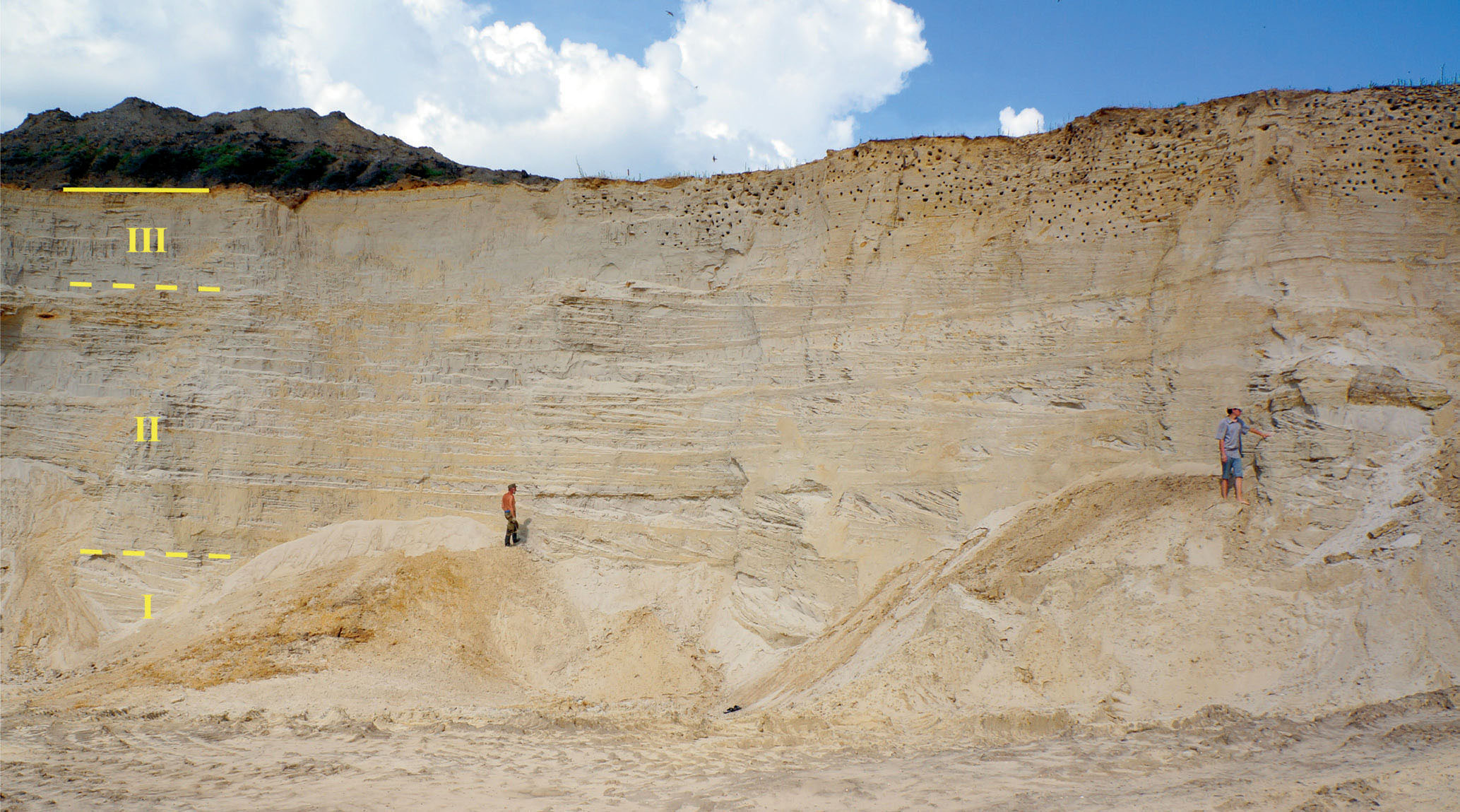 Рис. 2. Часть обнажения Алатырь I (фото автора, 2022 г.); слева показаны интервалы фаунистических горизонтов: I – efimovi, II – nageli, III – keuppi.