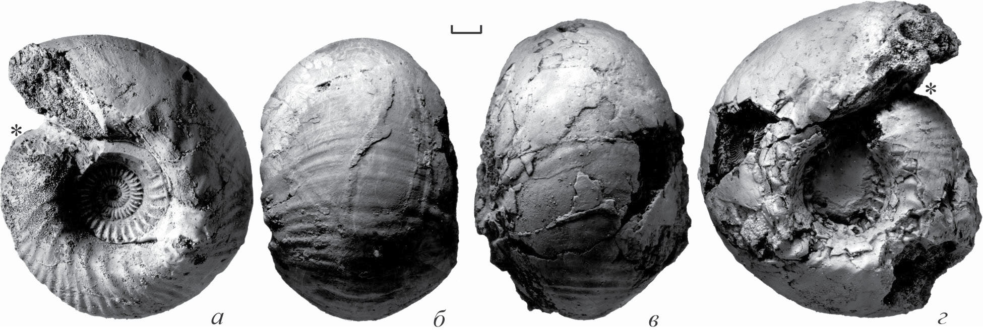 Рис. 4. Позднебатские макроконхи рода Cadoceras из бассейна р. Алатырь (× 0.5): а, б – C. calyx Spath; в, г – C. apertum Callomon et Birkelund. Длина масштабной линейки 10 мм; звездочкой (*) отмечено начало жилой камеры.