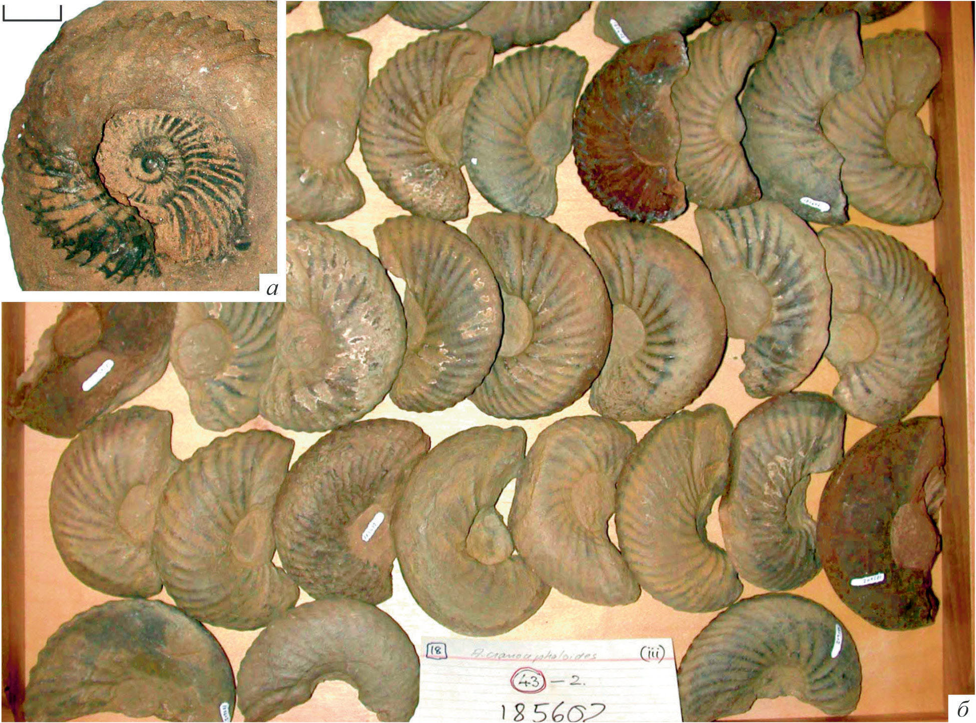Рис. 5. Arcticoceras cranocephaloide Callomon et Birkelund: a – микроконх [= Costacadoceras sp.], жилая камера с отпечатком фрагмокона, длина масштабной линейки 10 мм; б – выборка макроконхов, снимок вне масштаба; Восточная Гренландия, зона Cranocephaloide; Копенгагенский музей естественной истории, колл. Дж. Калломона и Т. Биркелунд; определения Дж. Калломона; фото автора.