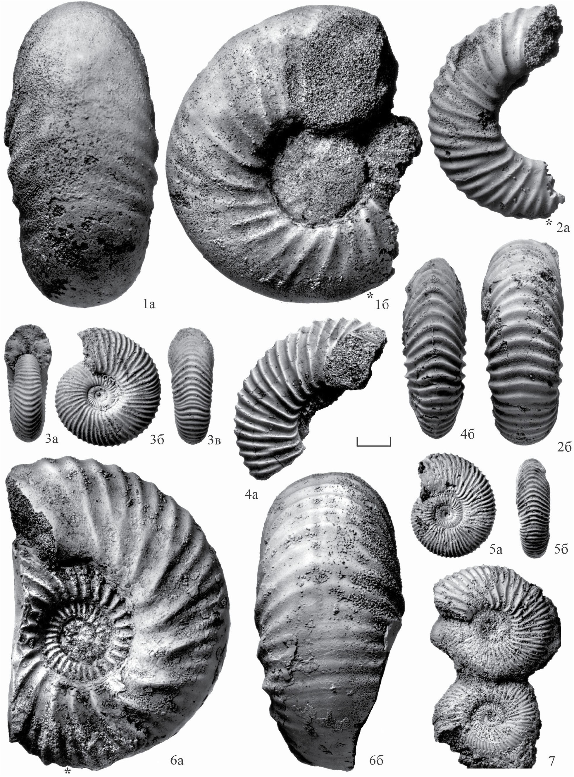 Рис. 6. Pseudocadoceras ex gr. mundum (Sasonov) (микроконхи Cadoceras falsum Voronetz) сбоку и с вентральной стороны: а, б – экз. ПИН, № 5029/193; в, г – экз. ПИН, № 5029/191; д, е – экз. ПИН, № 5029/194; ж, з – экз. ПИН, № 5029/190; и, к – экз. ПИН, № 5029/163; л, м – экз. ПИН, № 5029/192; Чувашия, Порецкий р-н, карьер у с. Порецкое; нижний келловей, зона Elatmae, фаунистический горизонт falsum. Длина масштабной линейки 10 мм; звездочкой (*) отмечено начало жилой камеры.