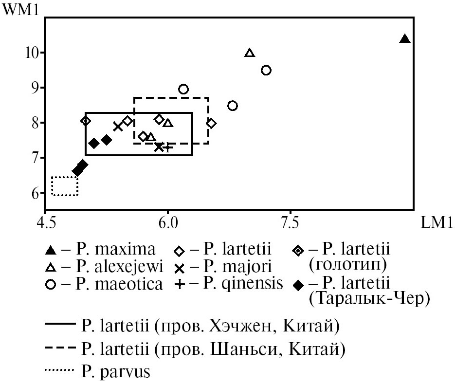 Рис. 7. Двухмерная диаграмма соотношения размеров М1 (W/L) Promephitis. Характер полей значений P. lartetii из Китая и P. parvus определяется интервалами промеров по: Wang, Qiu, 2004.