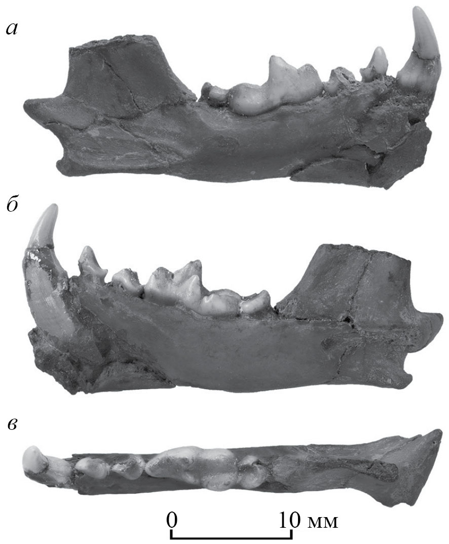 Рис. 3. Promephitis lartetii Gaudry, 1861, экз. ПИН, № 5126/767, правая ветвь нижней челюсти с c1, p2–m2: а – латеральная сторона; б – медиальная сторона; в – окклюзиальная сторона; Россия, Тува, Таралык-Чер; верхний миоцен.