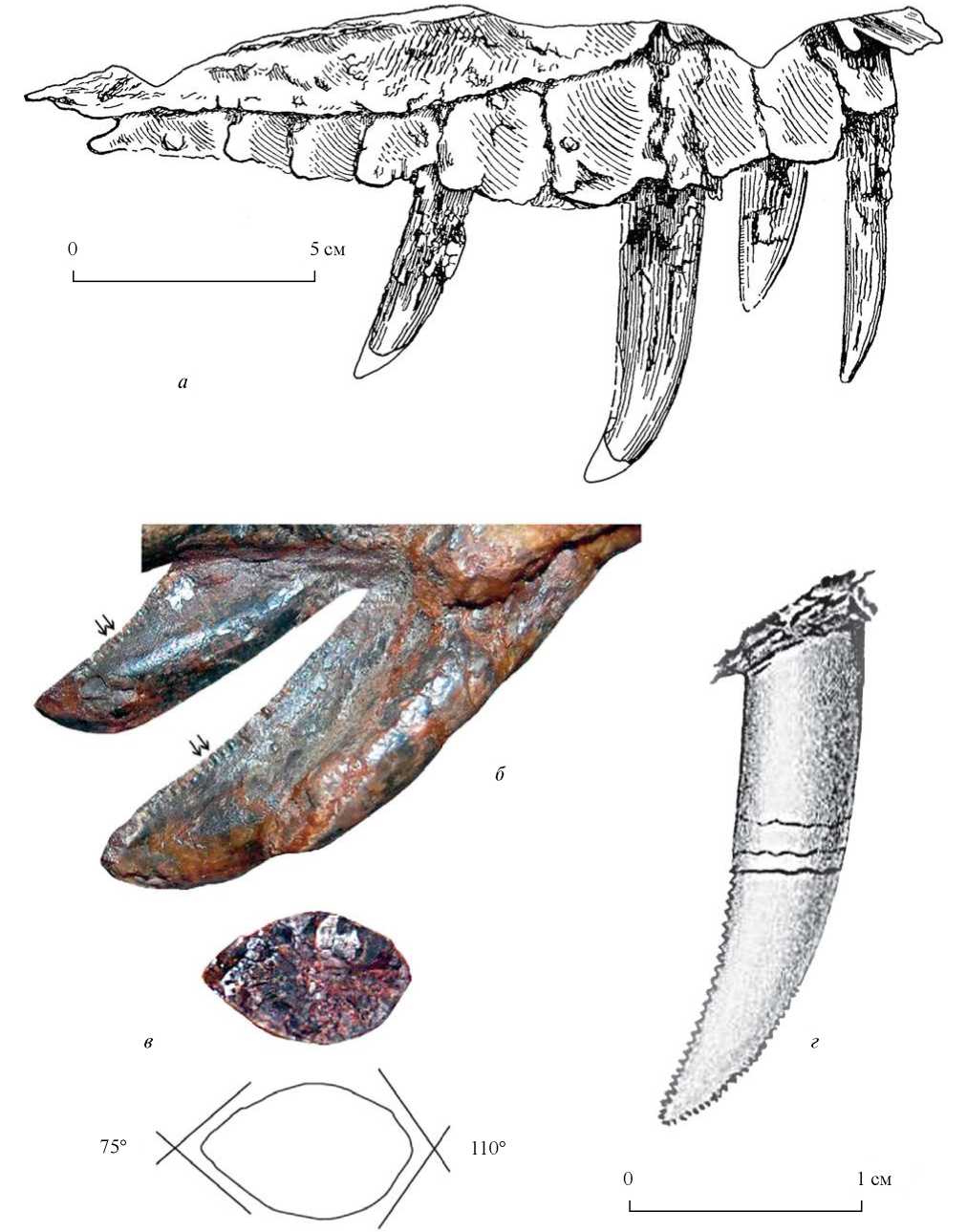 Рис. 8. а – прорисовка отпечатка правой верхнечелюстной кости крупной особи Ornithosuchus longidens (по: Walker, 1964); б, в — зубы правой верхнечелюстной кости Venaticosuchus rusconii: б — четвертый и пятый, вид с латеральной стороны, стрелками показаны зубчики на заднем режущем канте зуба, в — поперечный разрез первого зуба (по: Baczko et al., 2014); г — самый крупный зуб правой верхнечелюстной кости ювенильной особи Ornithosuchus longidens (по: Newton, 1894).