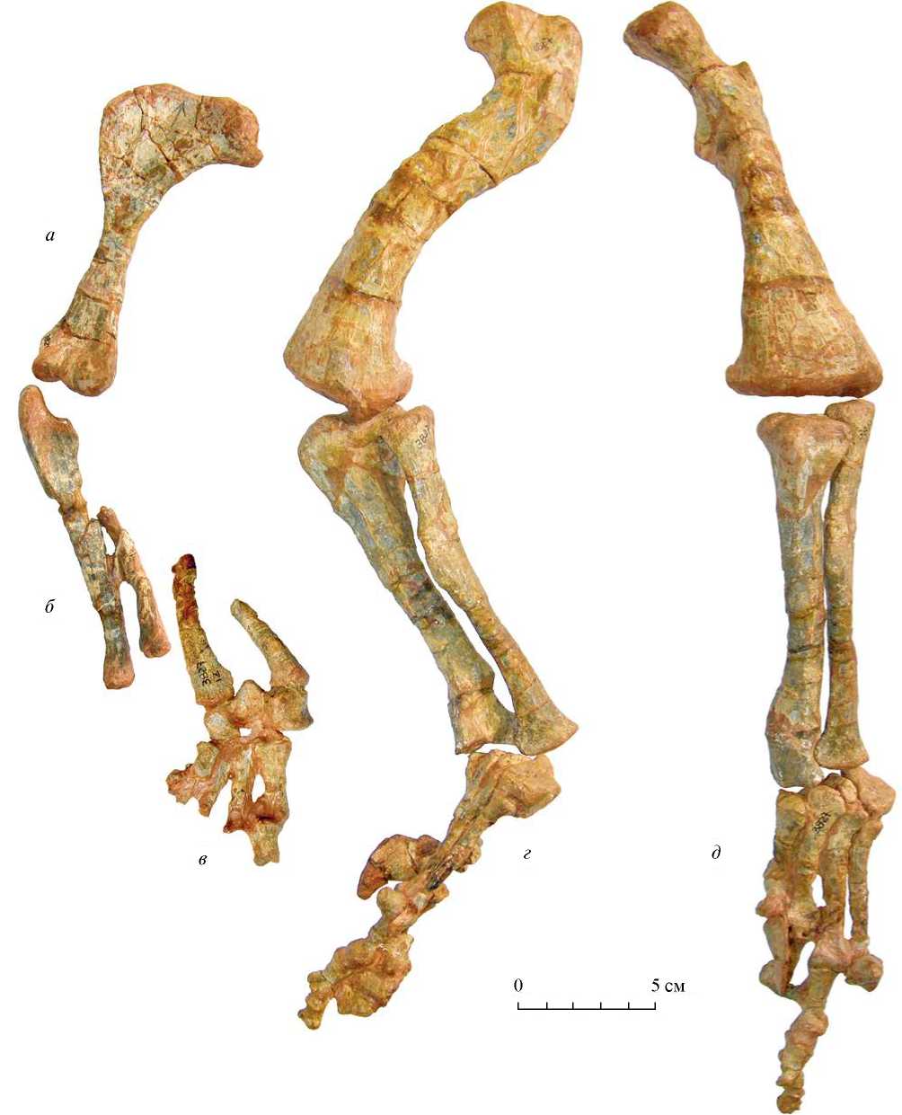 Рис. 10. Соотношение размеров и пропорции отделов передней и задней конечностей орнитозухида Riojasuchus tenuisceps; а–в — вид с медиальной (вентральной) стороны: а — Музей естественной истории Фонда Мигэля Лилло, экз. № PVL 3826, правая плечевая кость; б — Музей естественной истории Фонда Мигэля Лилло, экз. № PVL 3828, кости левого предплечья; в — Музей естественной истории Фонда Мигэля Лилло, экз. № PVL 3827, дистальная часть костей предплечья и неполная кисть левой передней конечности; г, д — Музей естественной истории Фонда Мигэля Лилло, экз. № PVL 3827, скелет левой задней конечности: г — вид слева, д — вид с проксимальной (дорсальной) стороны. Фото А.Г. Сенникова.