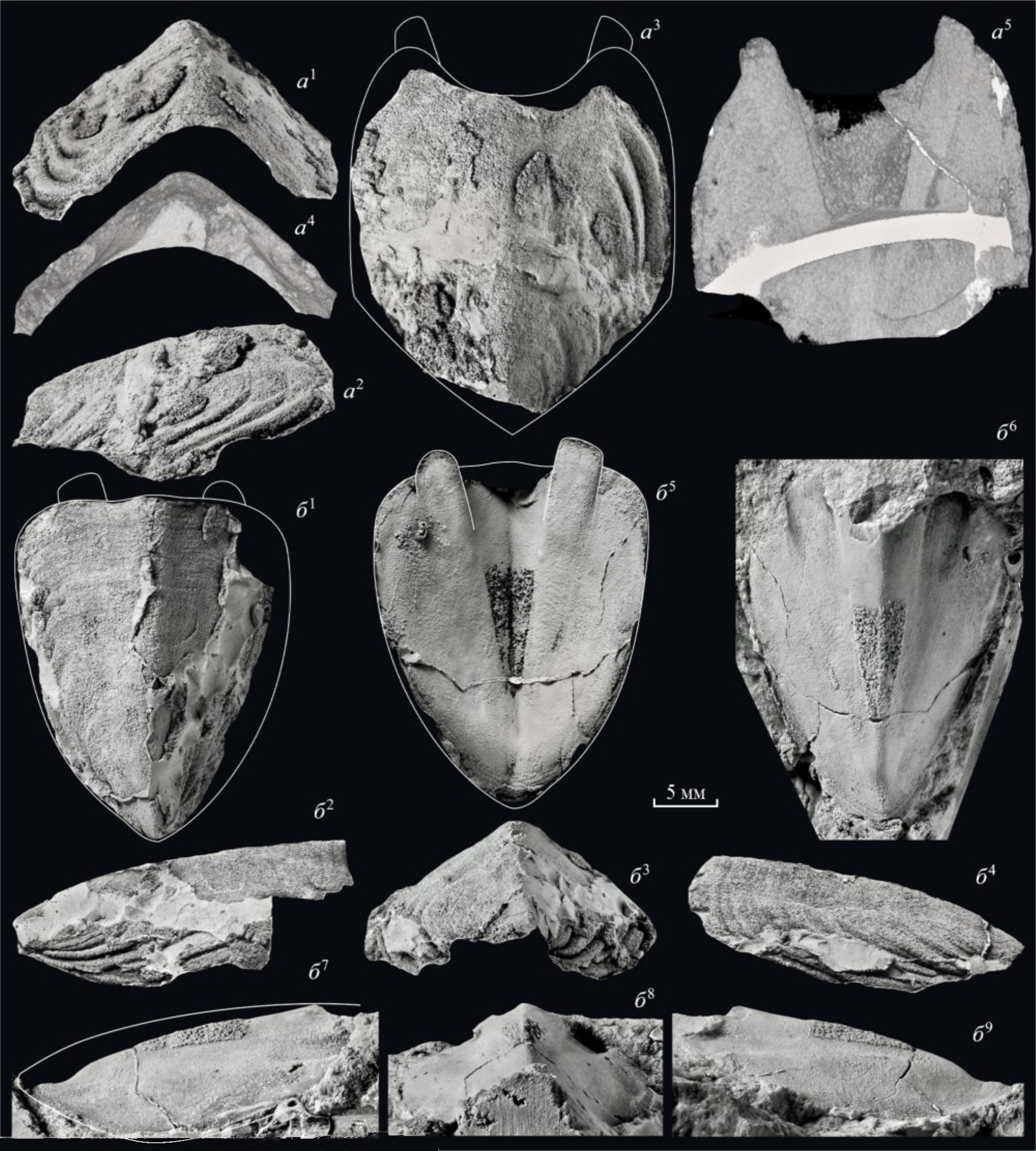 Замечания. На основе различий в размерах и форме щитков из местонахождения № 5538/7 предлагается их возможная нумерация. Промежуточный щиток экз. ПИН, № 5538/7-292 (рис. 2, б1) отличается минимальной длиной по отношению к ширине, минимальным югальным синусом (очень широким и мелким, его реконструкция сделана на основе форм линий роста). Расстояние между апофизами максимальное, в то время как у хвостового щитка это расстояние минимальное. Резонно предположить, что это щиток II. В таком случае нумерация трех промежуточных щитков паратипа ПИН, № 5538/7-293, расположенных в породе один над другим (рис. 1, б, в), может соответствовать одному из порядков: III–V, IV–VI или V–VII. Верхний из них, как показано на рис. 5, г1, обладает примерно таким же расстоянием между апофизами, как на щитке II. Отличия в остальных признаках свидетельствуют о том, что между верхним щитком и щитком II должен был размещаться как минимум еще один. С другой стороны, щиток, развернутый в паратипе в противоположную сторону от остальных двух (рис. 1, б, в) имеет довольно широко расставленные апофизы по сравнению с хвостовым щитком (рис. 5, г3). Кроме того, экземпляр из местонахождения № 5538/10 демонстрирует максимально сближенные апофизы (рис. 5, б), и он может быть щитком VII. Таким образом, промежуточные щитки паратипа, скорее всего, отвечают порядку IV–VI (рис. 5, г). В предложенном ряду наблюдаются последовательные изменения угла V-образного заднего края от 115° на щитке II до 90° на щитке VII, увеличение их килеватости в направлении к хвостовому щитку, а также закономерное изменение ширины щитков с максимальной шириной в средней части тела (рис. 5).