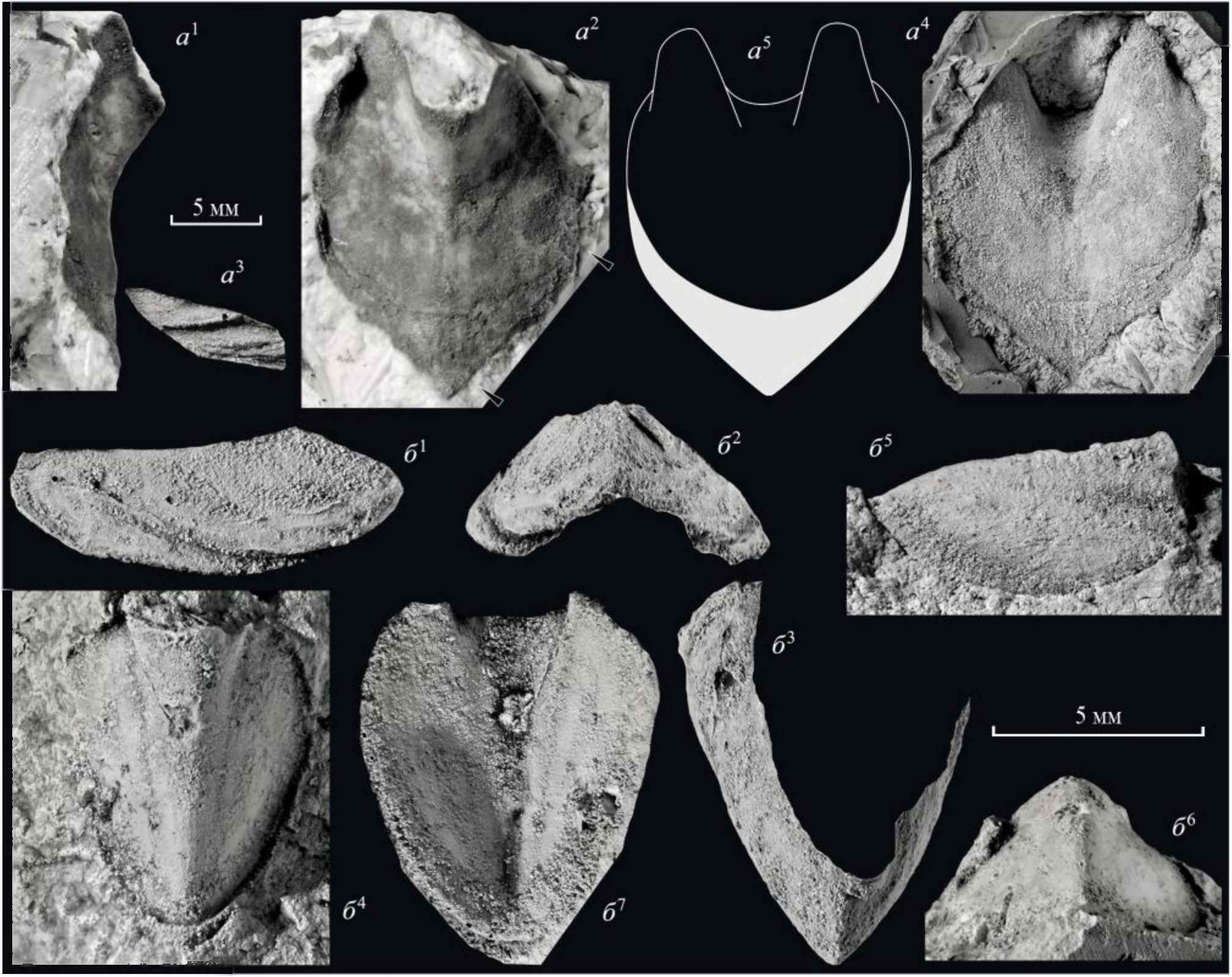 В коллекции имеется еще один хвостовой щиток (экз. ПИН, № 5538/10-551; рис. 4, б), который более чем вдвое меньше голотипа и отличается высотой отпечатка вентральной поверхности (рис. 4, б6). Однако углы наклона латеральных поверхностей этих экземпляров сопоставимы между собой. Наблюдаемая изменчивость, вероятно, объясняется возрастными изменениями, в т. ч., непропорциональным увеличением толщины тегментума.