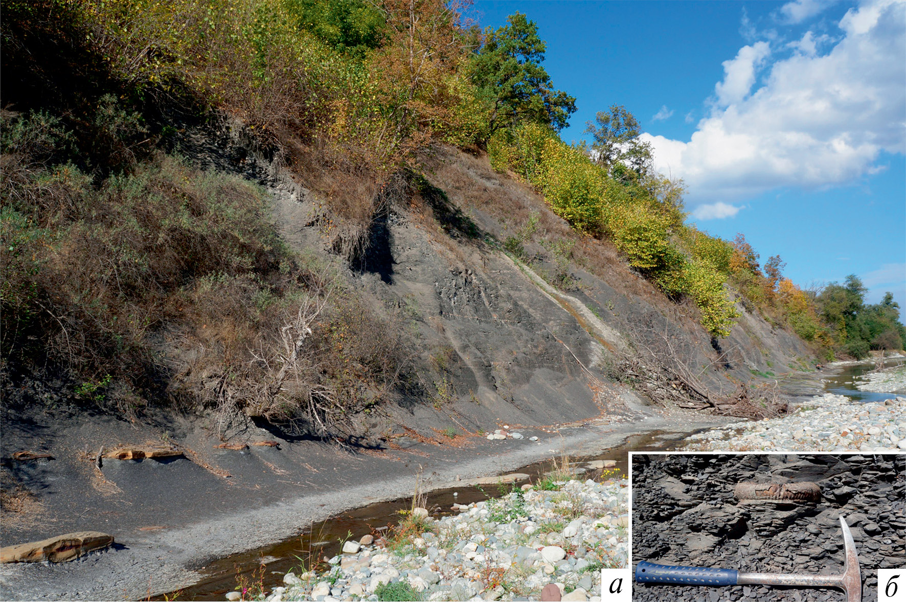 Рис. 2. Часть обнажения нижнего байоса (зоны Humphriesianum) на левом берегу р. Большой Зеленчук у аула Даусуз (а) и раковина Stephanoceras humphriesianum (J. de C. Sowerby) in situ (б).