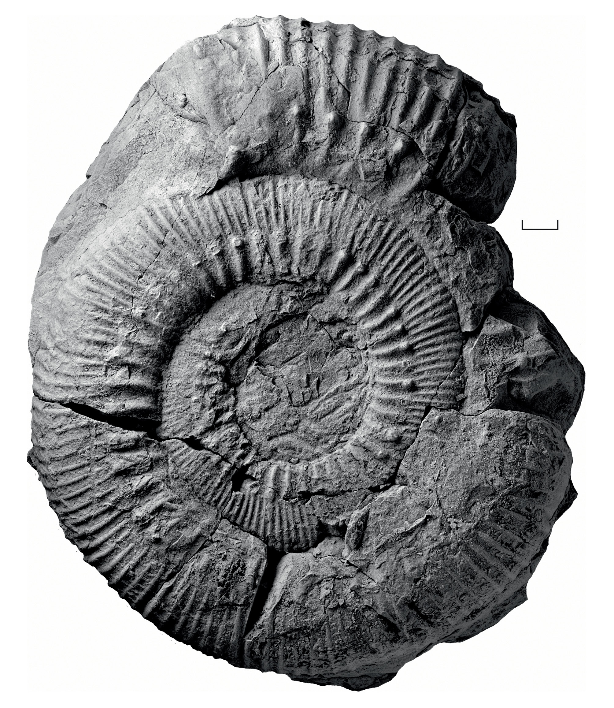 Фиг. 1. Stephanoceras humphriesianum (J. de C. Sowerby), экз. ПИН, № 5546/394; Карачаево-Черкесия, Зеленчукский р-н, р. Бол. Зеленчук у аула Даусуз (местонахождение 18); нижняя подсвита джангурской свиты; нижний байос, зона и подзона Humphriesianum, фаунистический горизонт humphriesianum. Длина масштабной линейки 10 мм; звездочкой (*) отмечено начало жилой камеры.