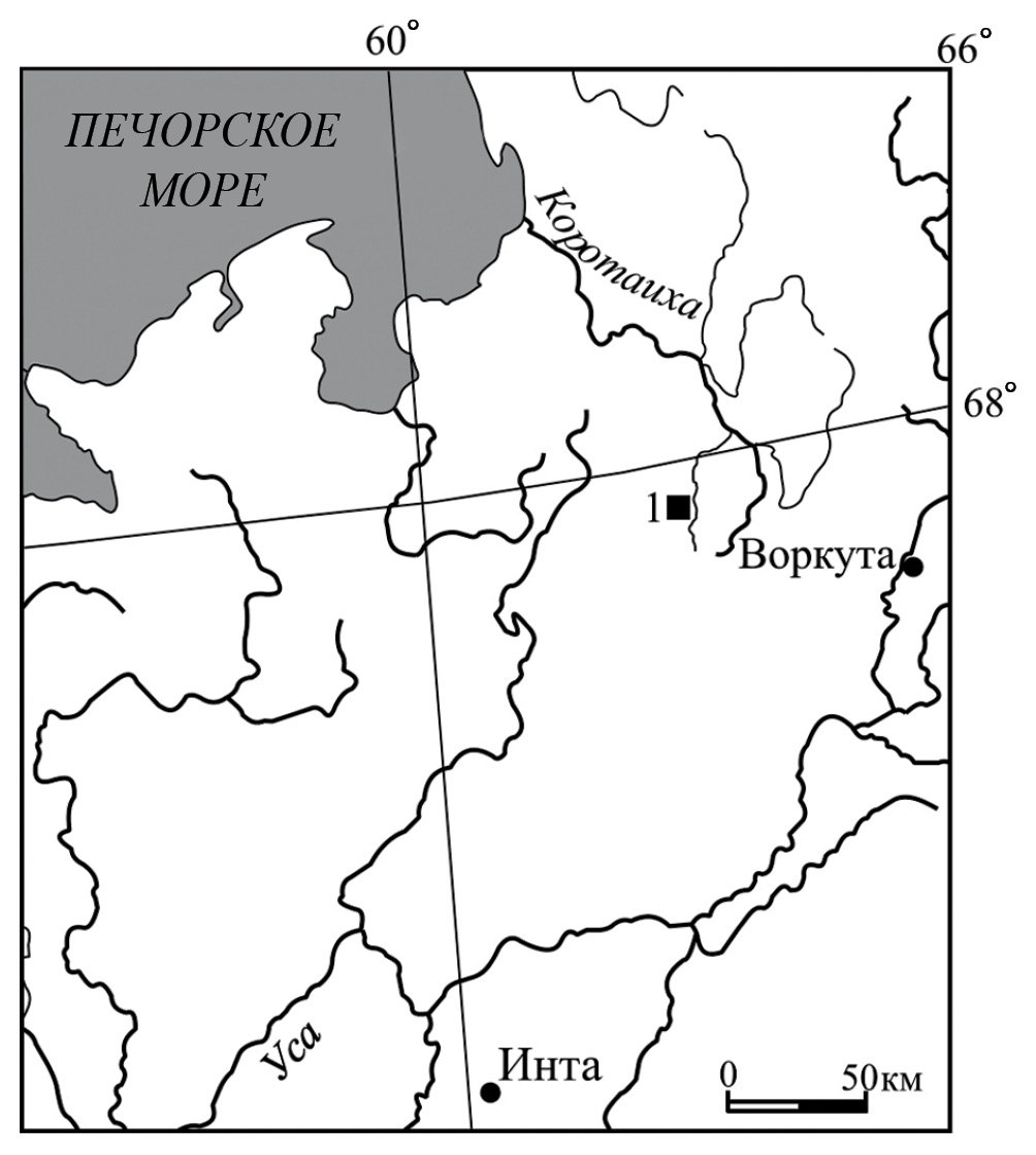 Рис. 1. Схема расположения разреза силура на гряде Чернова: 1 – местонахождение Lingulipora? sp. в бассейне р. Падимейтывис.